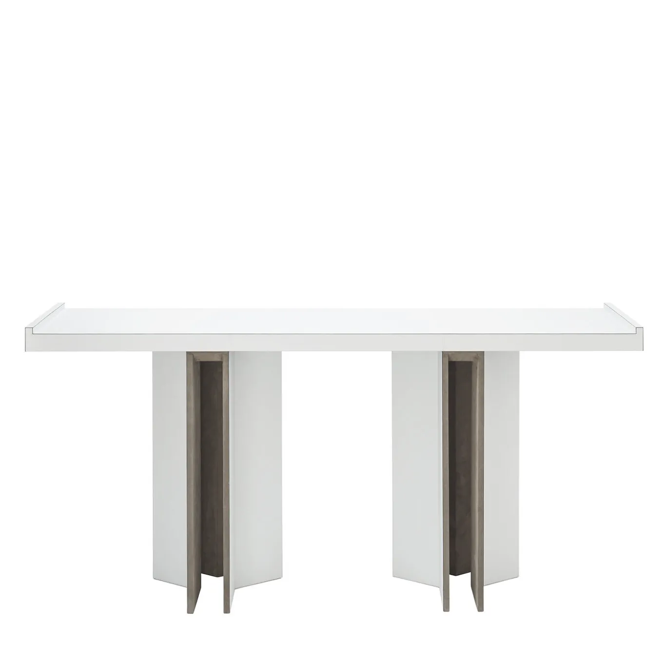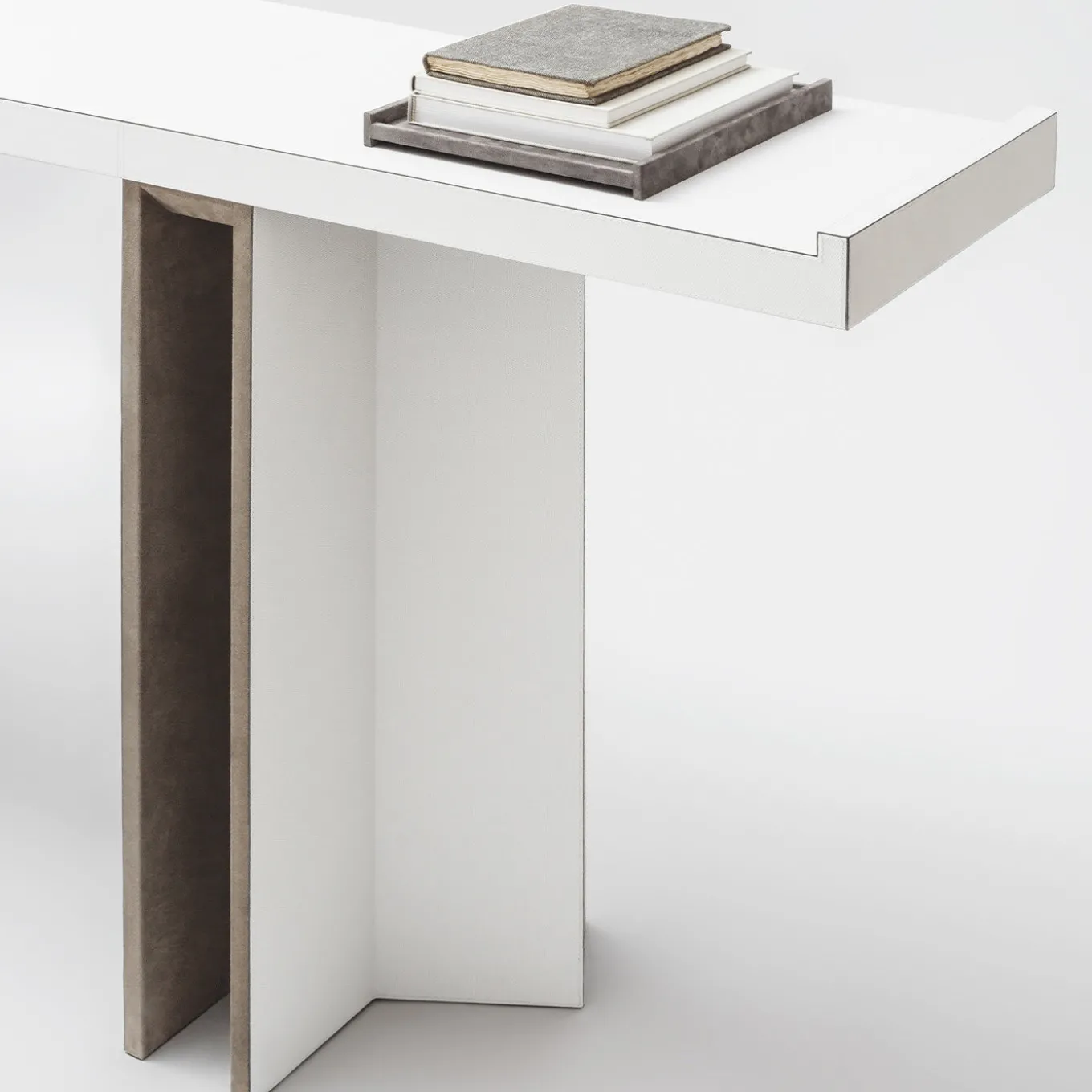 Channeling the traditional oriental style, this leather console exudes luxury without ostentation, bringing elegance to a contemporary interior. The name of the collection (“bivio” means “junction” in Italian) references to the architectural base made of three folded wooden slabs lined in beige suede and covered in white leather supporting a narrow rectangular top. Customization is available upon request.