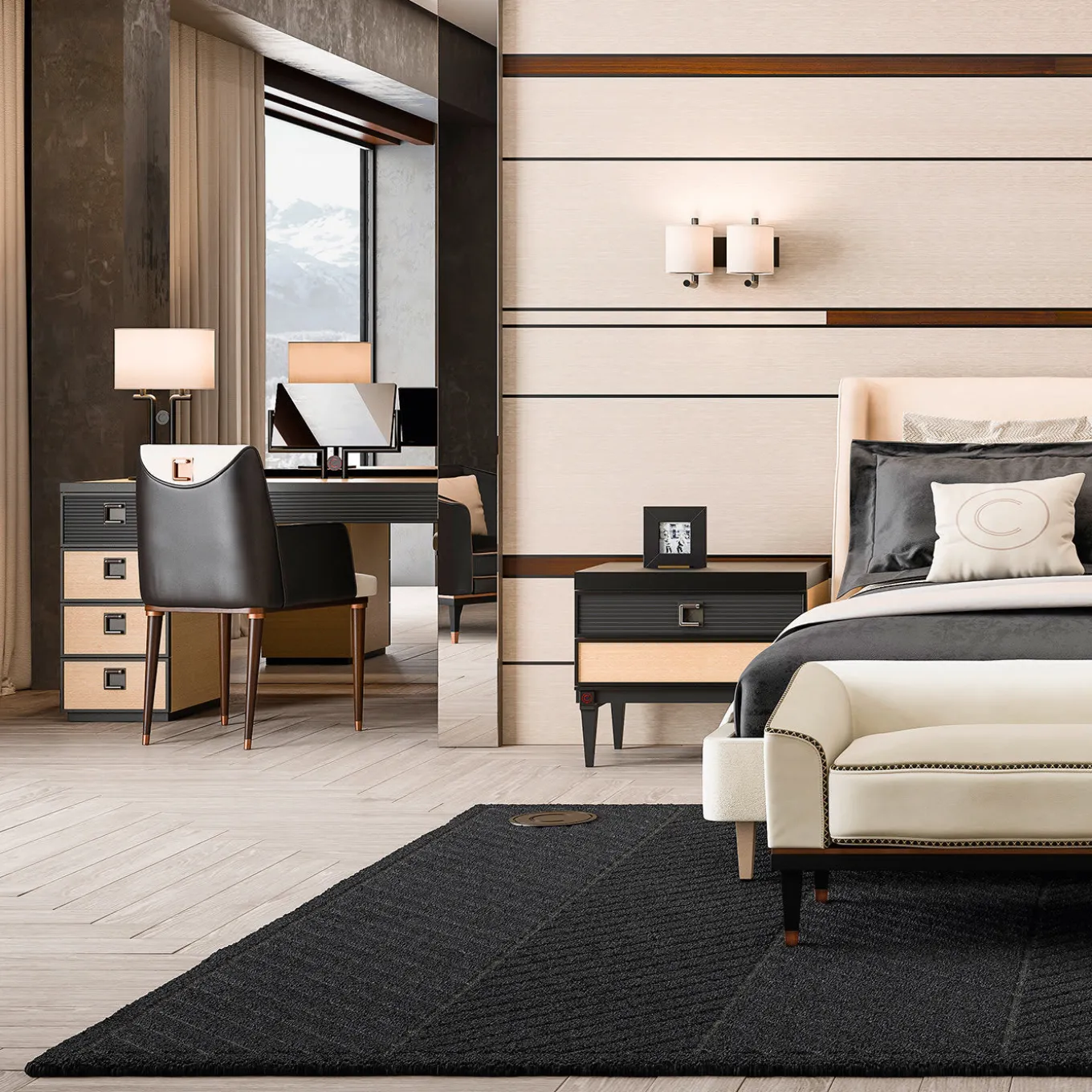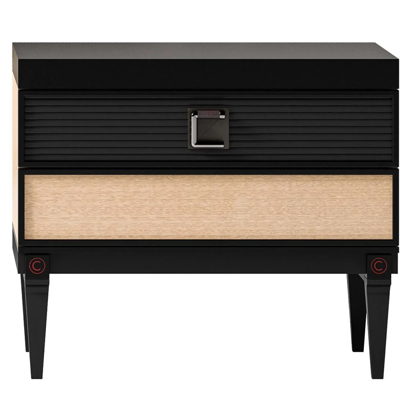 Functional yet elegant, this superb bedside table is inspired by traditional mid-century designs with a sculpted frame and neatly tapered legs. With a stunning eucalyptus veneer, the frame features a black-lacquered finish with beige panels on the sides and front of the bottom drawer. The top drawer has a ridged surface and is accented with a knob with the company logo. A thick, rectangular metal top completes the look of this nightstand that can be paired with a twin as a nightstand, or next to a sofa as an occasional table in a mid-century modern decor.