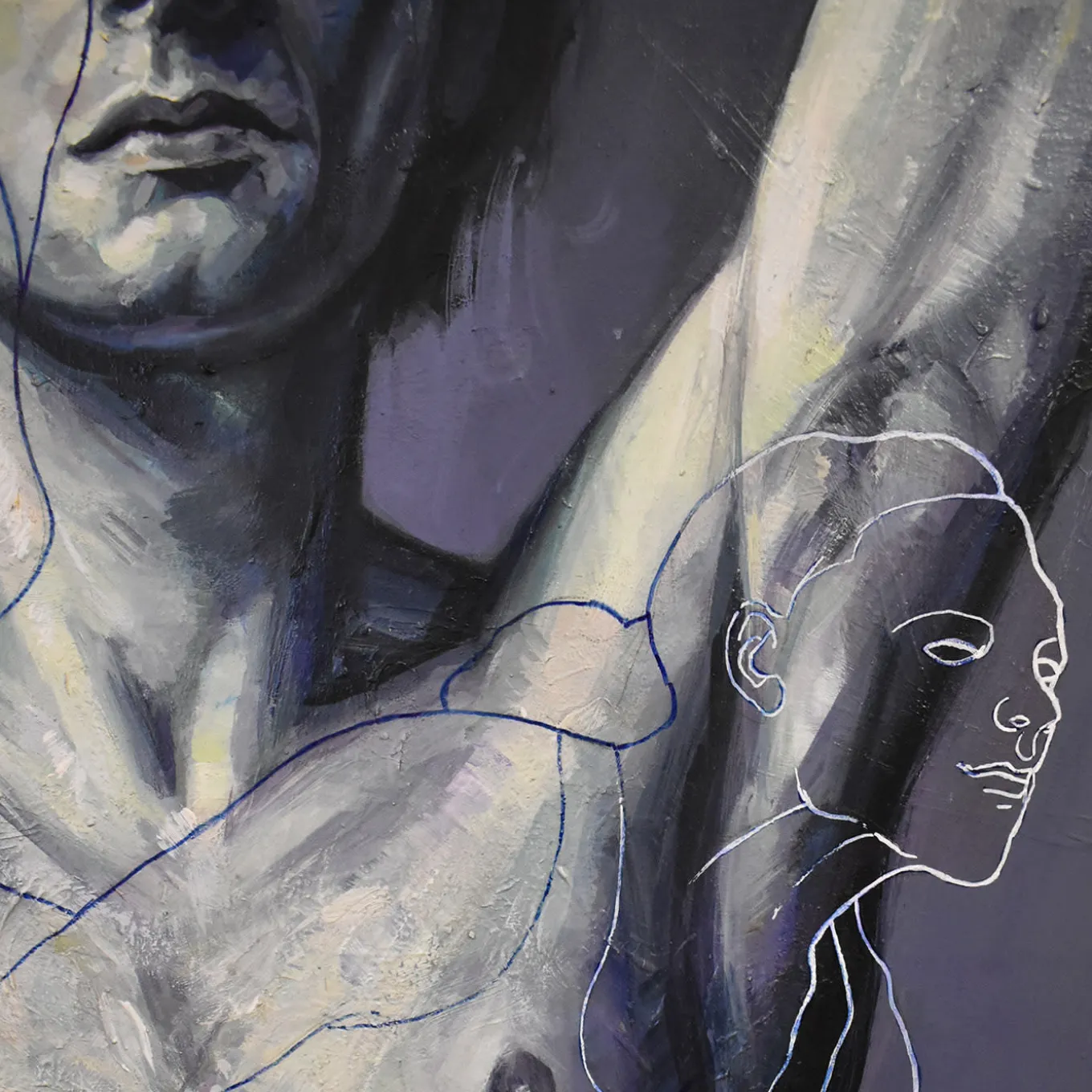 Oil and acrylic on canvas. Black and White, a diptych of two men who appear as life has made them. They are two athletes who seek understanding from those who look at them. Who won? The White, who raises his hands in triumph, but looks like a Christ on the cross or a Saint Sebastian close to martyrdom? The Black, tough-looking but shrinking? Appearing strong, but doubts, defeats, and fragility are hidden in their souls, appearing as emerging figures. Made up of two canvases (57×78 cm each).