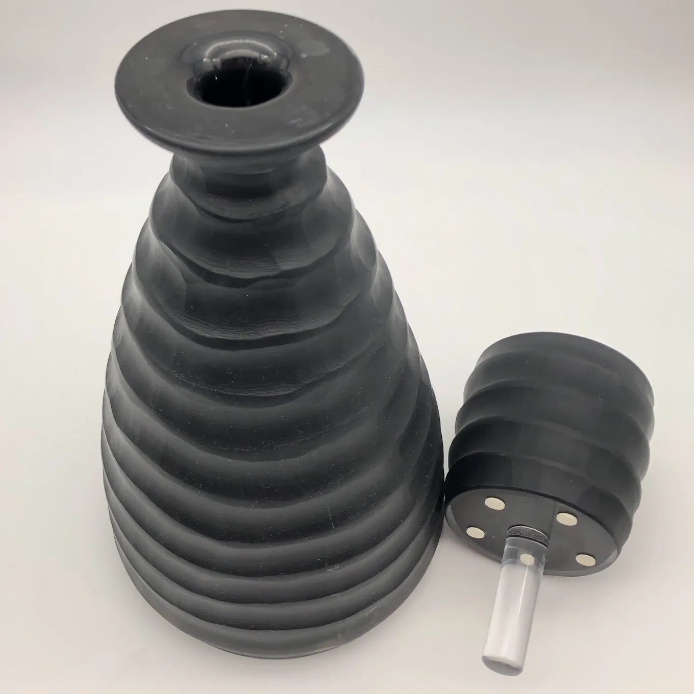 A singular way of serving cool water during a Sunday lunch, this black bottle with lid combines traditional craftsmanship and contemporary aesthetic in a captivating cone-shaped silhouette. Entirely handmade of glass by master glassblower Achille D’Este and carved by hand by glassmaker Renzo Vianello, it flaunts an irregularly-ribbed shape that lends it a unique charm.
