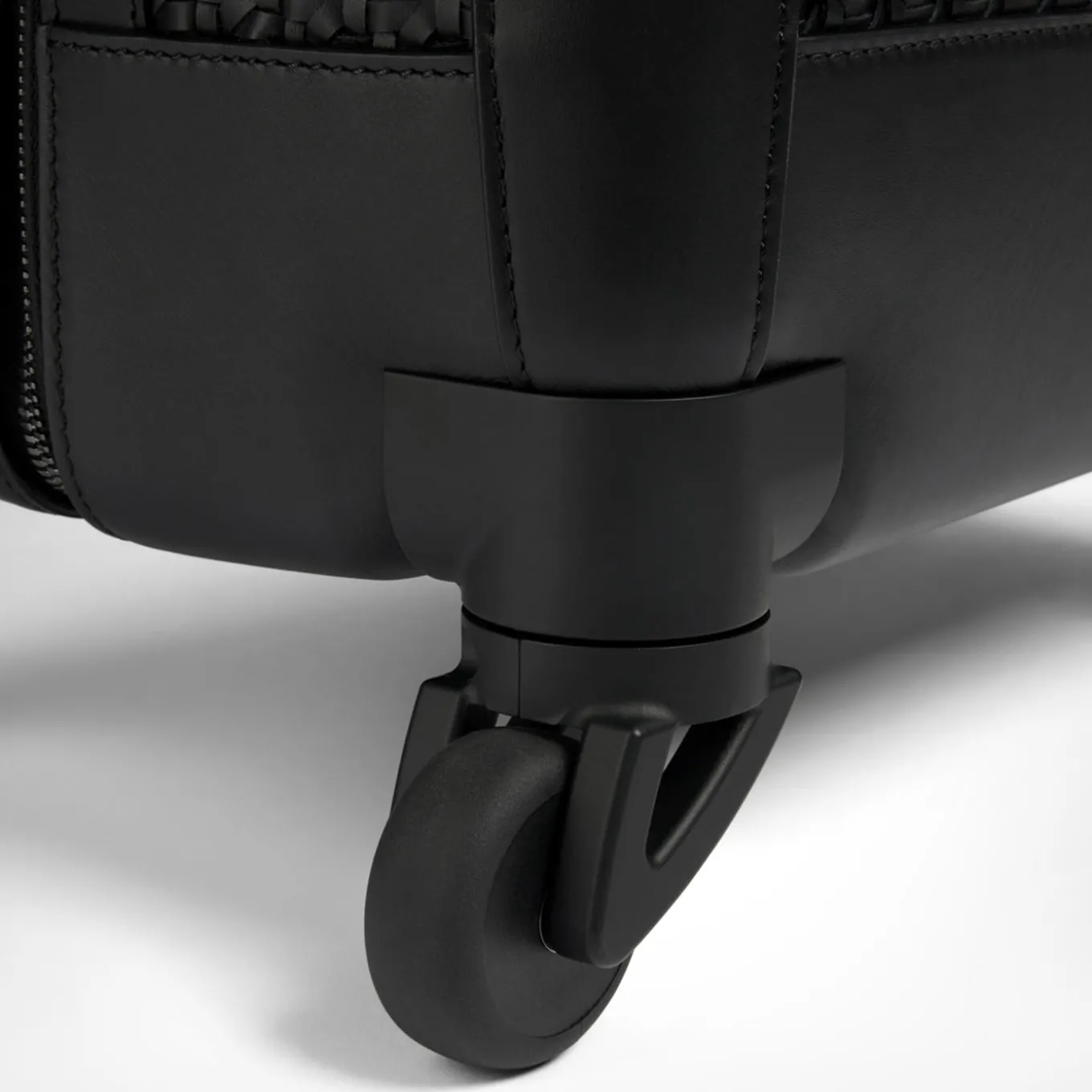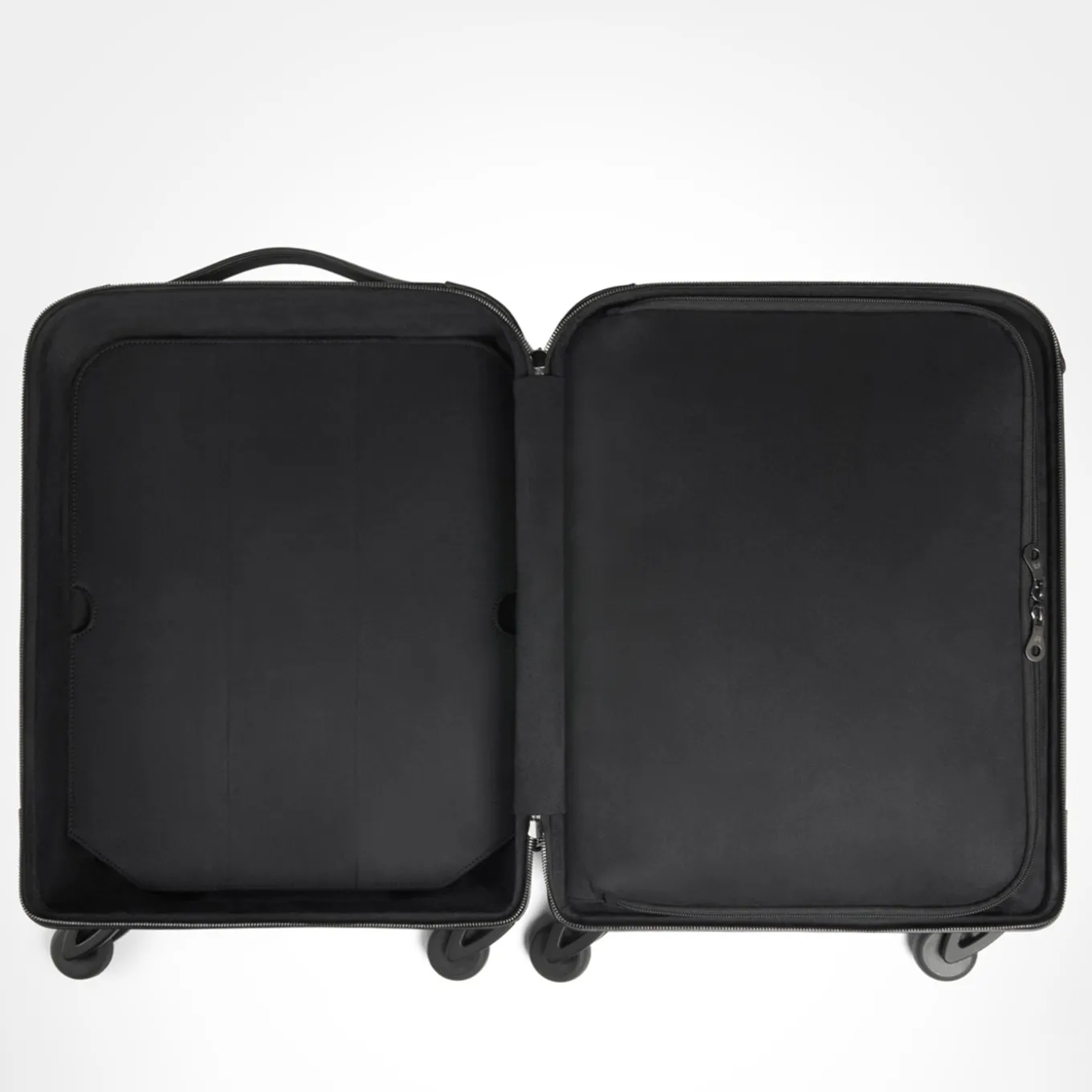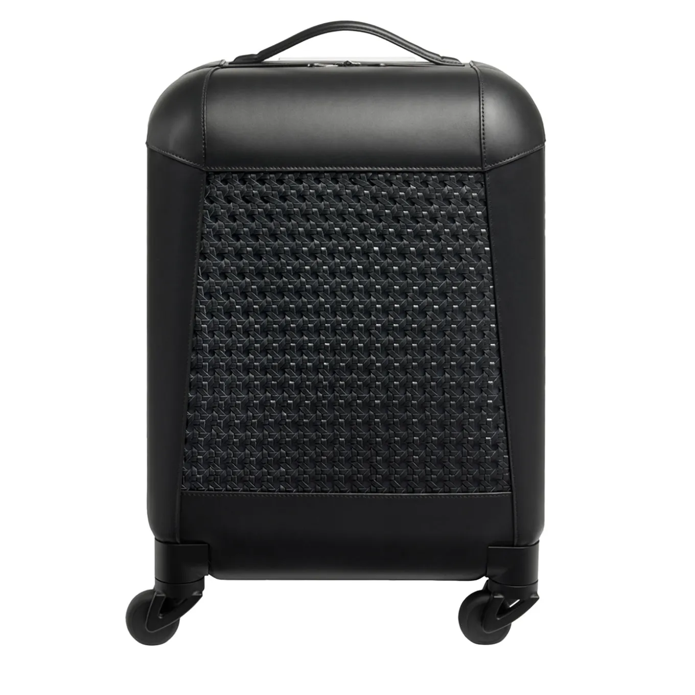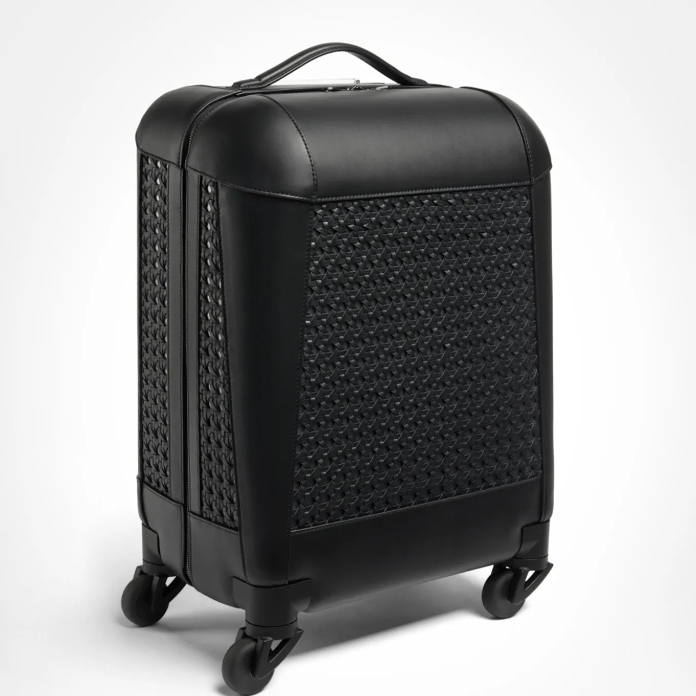 Hand-crafted by master artisans, this carry-on combines the finest calf-skin leather with technical, innovative components. The wheel casters are forged from aviation-grade aluminum for maximum stability and longevity. The “silent wheels” contain a sound-absorbing air chamber for minimal noise disruption. The transparent, buttonless handle is carved out of a solid block of Lucite. The interior is lined in durable, luxurious Alcantara and features two compartments for valuables and accessories.
