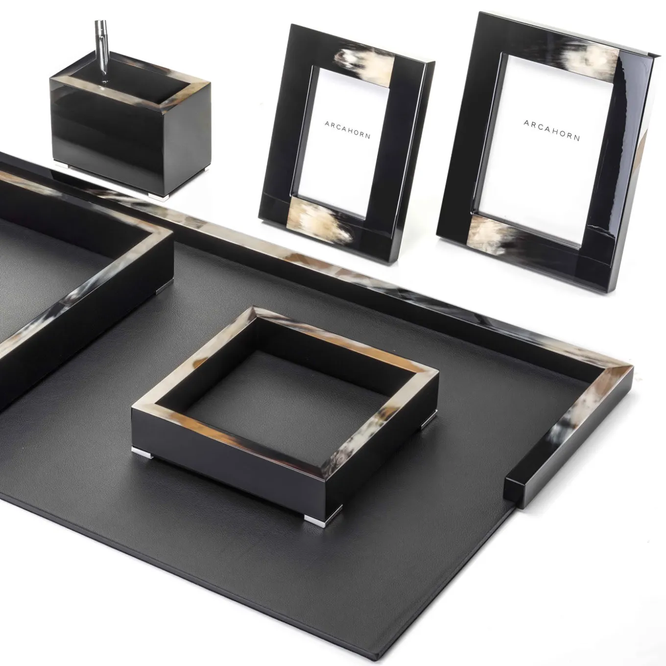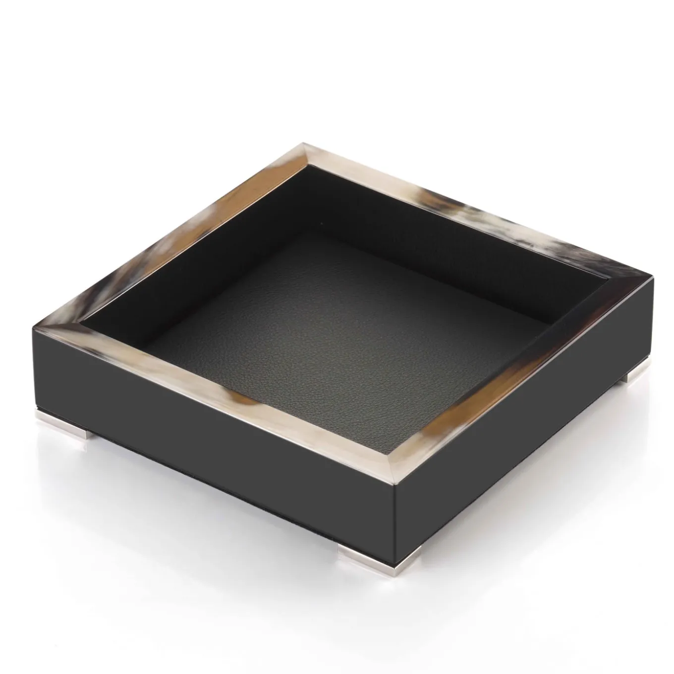 The natural richness of dark horn combines with the polished and restrained design characterizing this versatile table object. Sitting atop four tiny feet in chromed brass, this elegant desk organizer displays a black lacquered structure crafted of horn and wood with a top in a glossy finish. The internal upholstery in prized Tosca leather also contributes to the exclusive flair of this piece.