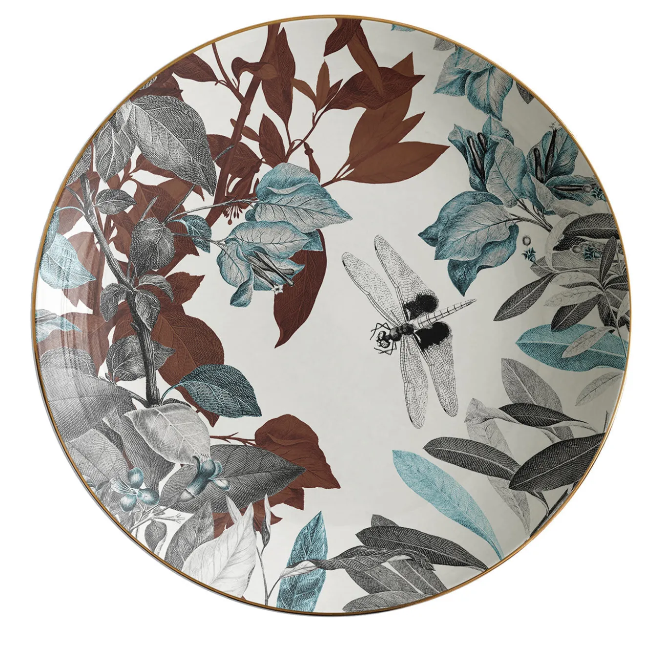 The relaxing ambiance of the Black Dragon pond in Jade Spring Park inspired designer Vito Nesta for this splendid set of two plates in fine porcelain. The free combination of a delicate dragonfly with foliage in gray and rust-red tones with teal accents lends the set a strongly evocative flair, reminiscent of its typical flora and fauna that appears emerging from a luminous, white backdrop.