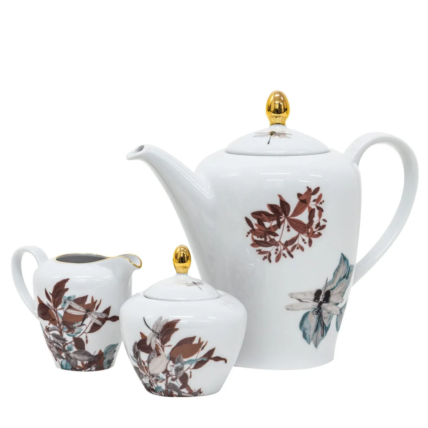 Designer Vito Nesta drew inspiration from the suggestive Black Dragon Pool in Jade Spring Park to create this alluring tea set composed of a tea mug, a sugar bowl and a milk jug. A dragonfly is depicted in the midst of lush foliage in warm and cool tones that create a pleasant chromatic contrast with the rust-red backdrop. This set will make for a precious housewarming gift.