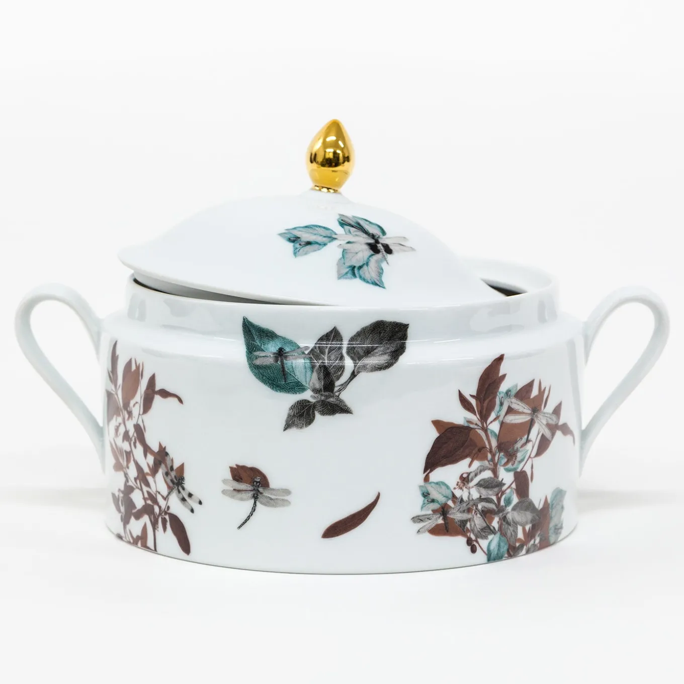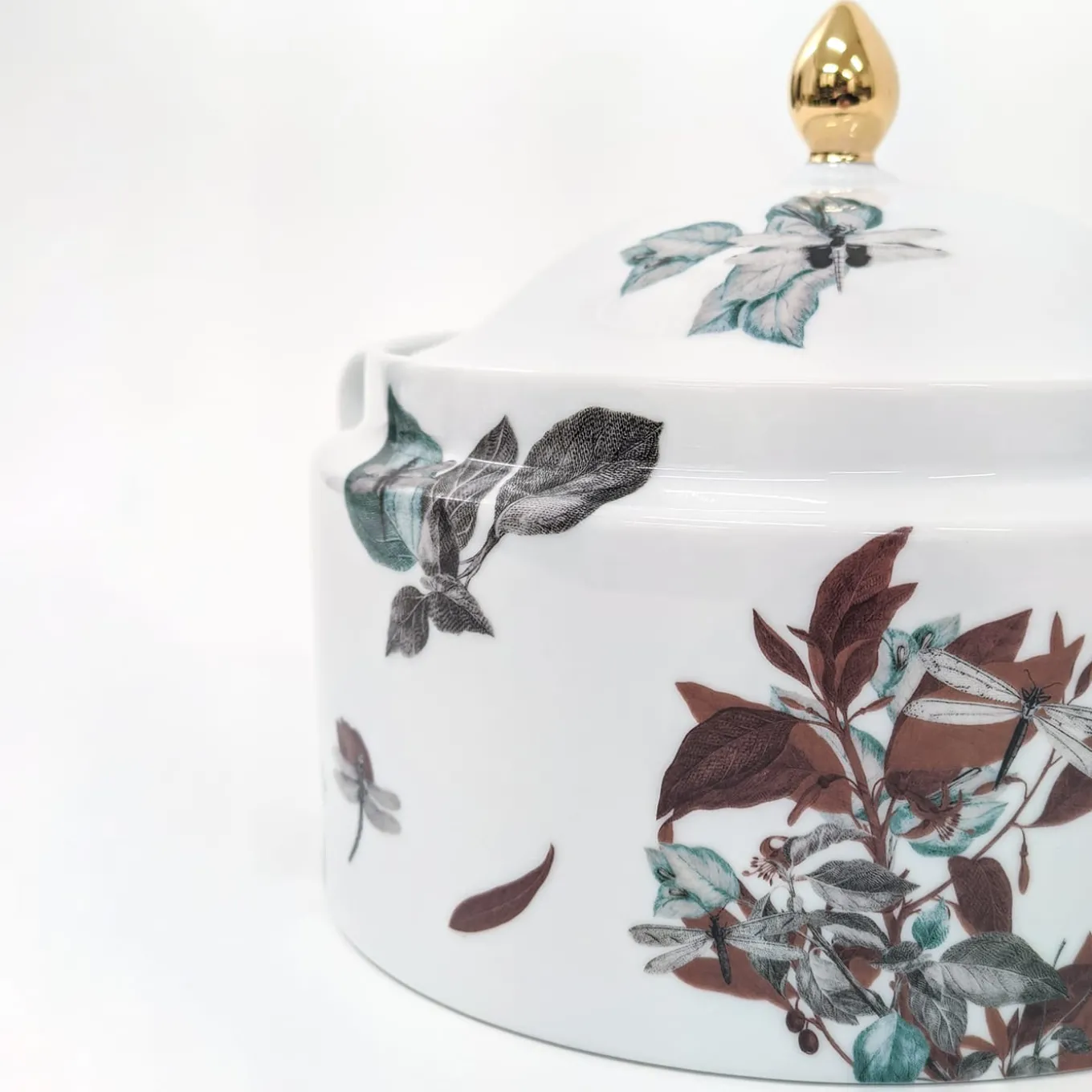 Designer Vito Nesta drew inspiration from the suggestive Black Dragon Pool in Jade Spring Park to create this gorgeous soup bowl. A dragonfly is depicted in the midst of lush foliage in warm and cool tones that create a pleasant chromatic contrast with the rust-red backdrop.