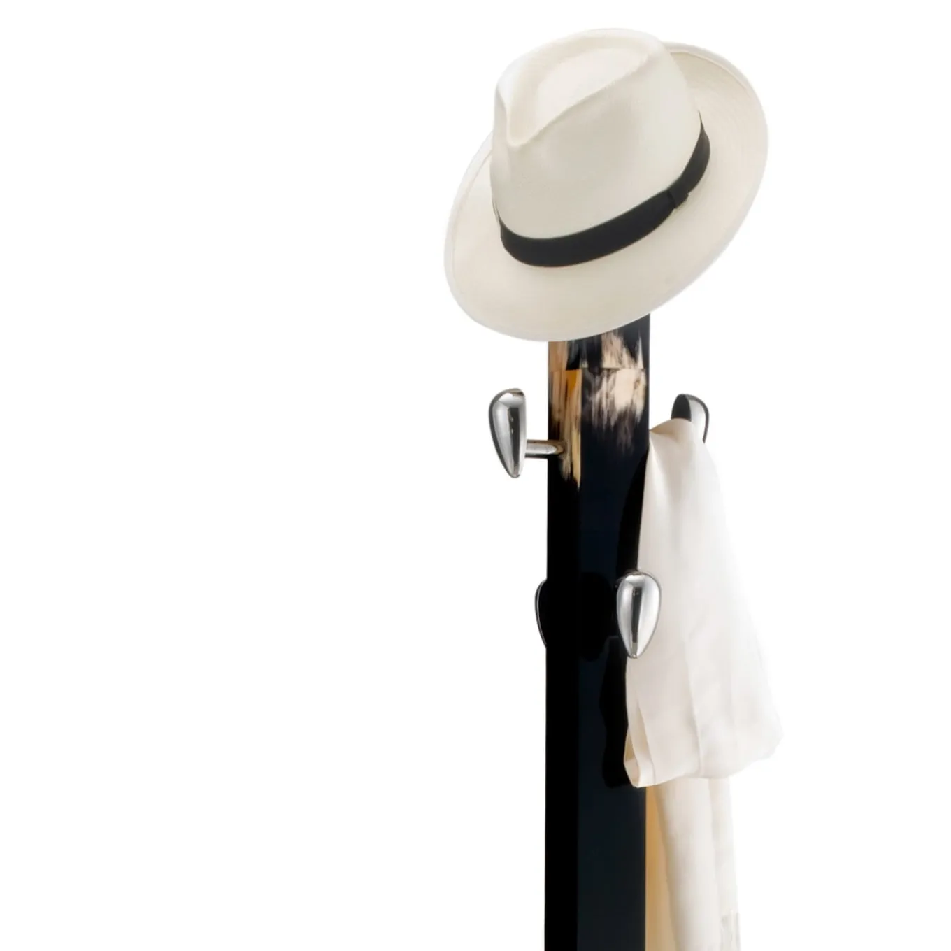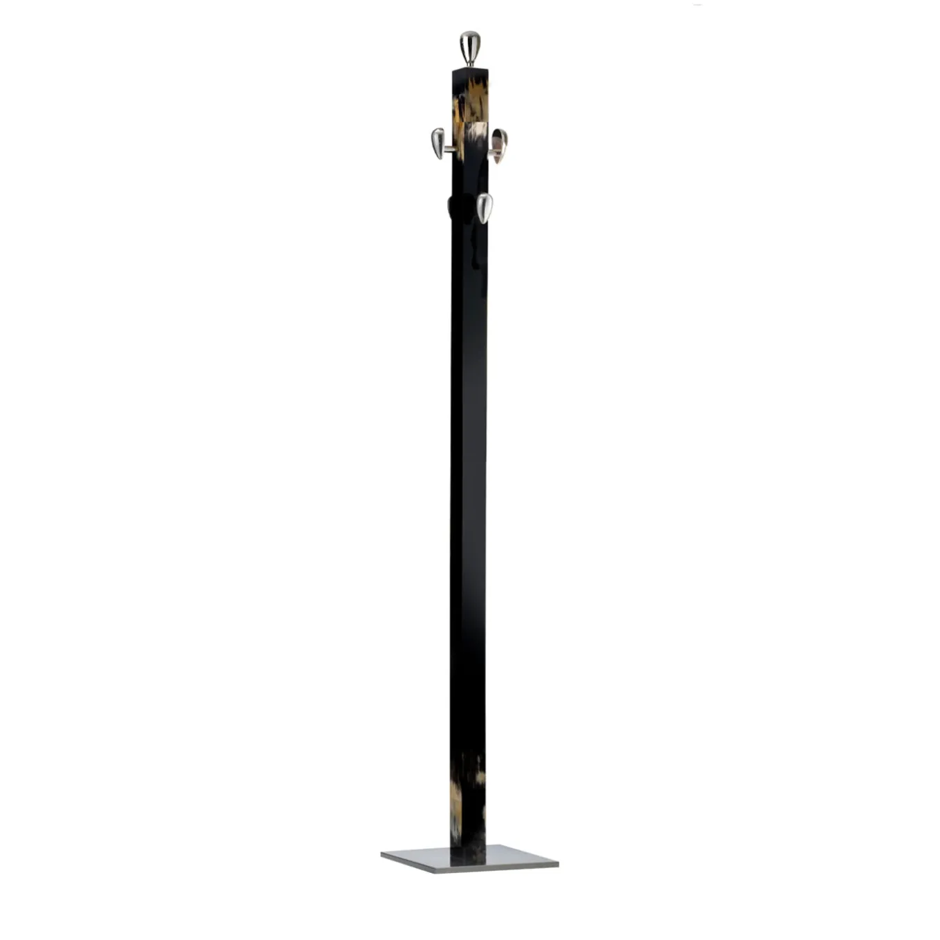 This exclusive and elegant piece combines luxurious materials and design with a clean and contemporary silhouette. Rising from a square base in chromed brass, the top and bottom of the tall lacquered black wood structure are enriched with dark horn details with exquisite nuances resulting from an exclusive manufacturing technique. Five egg-shaped knobs made of chromed brass offer a stylish and convenient place to hang coats, hats, and accessories. The sculptural quality of this coat rack will make it a refined, modern decorative accent even when empty.