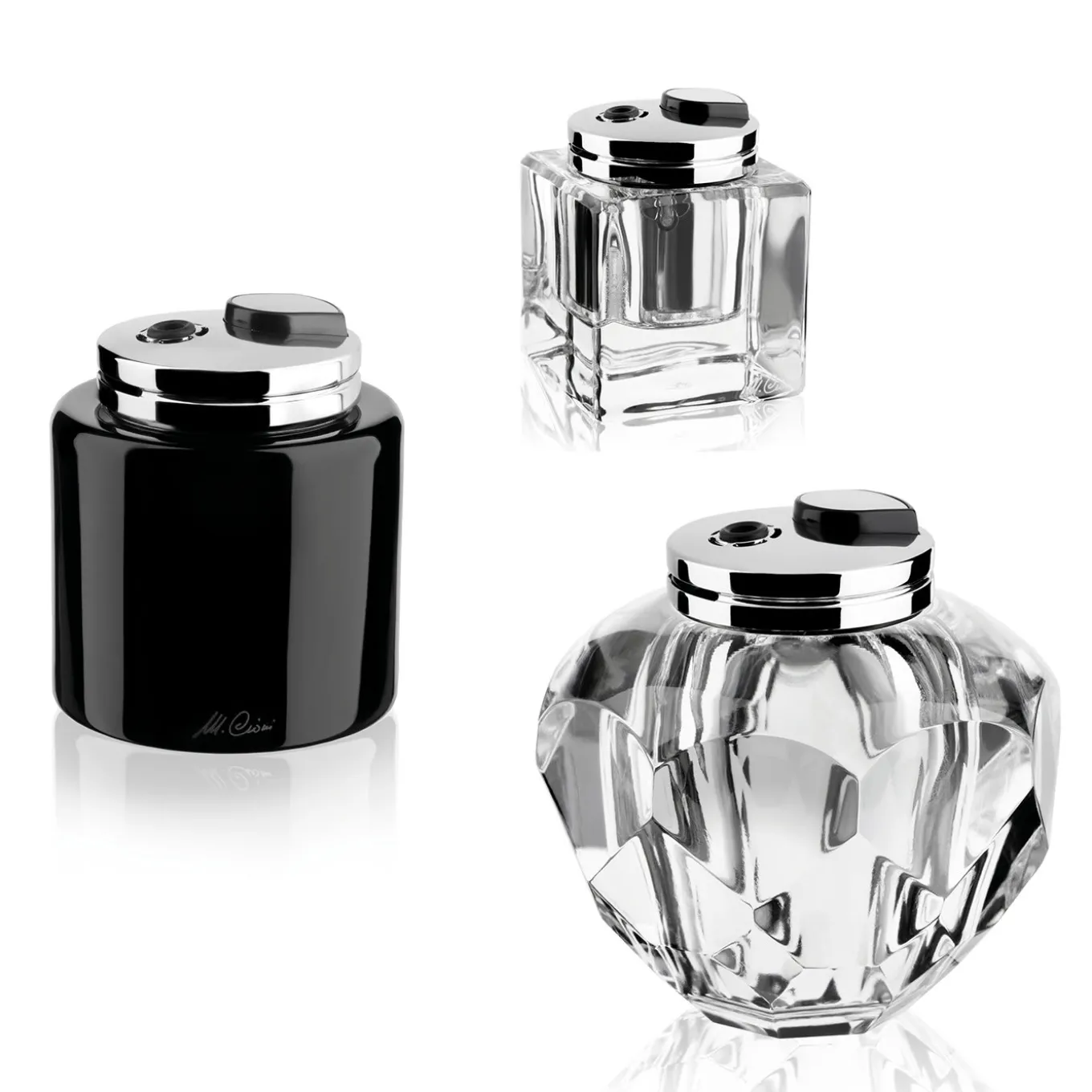 Ergonomic lighter in black crystal. A cylinder with a round top that hosts the mechanical ignition of a high precision, rechargeable. It features pure lead crystal with over 24% PbO.