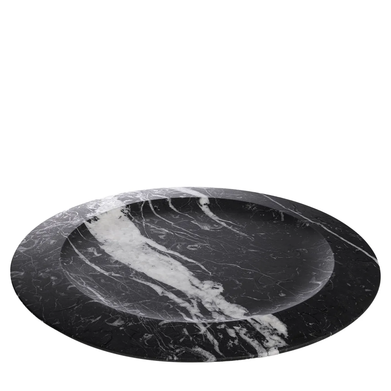 The eye-catching design distinguishing this refined round plate in black Marquina marble will stand out on any contemporary table. Timid, light veins interrupt the darkness of the precious stone in always new and unpredictable ways, demonstrating nature’s limitless artistic potential. This plate features a slightly accented divot to enhance the food served within. The soft contours celebrate the sober lines elevated by architect Angelo Mangiarotti. Please note that marbles and stones are natural materials and they can differ also if coming from the same quarry or the same block. The product shown may differ from purchased items. Every piece is unique.