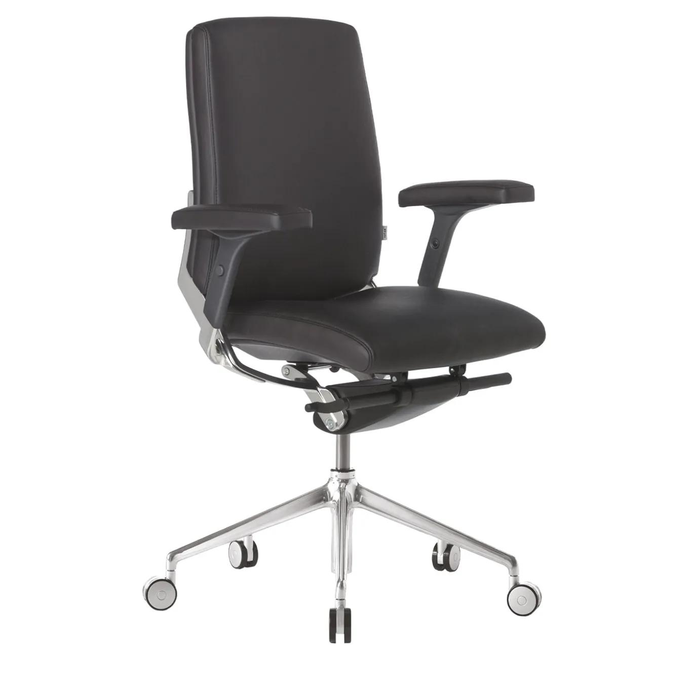 This elegant upholstered executive armchair is characterized by a medium backrest and a 5-star base, that can swivel and move up and down. Fixed armrests are enriched by upholstered pads.