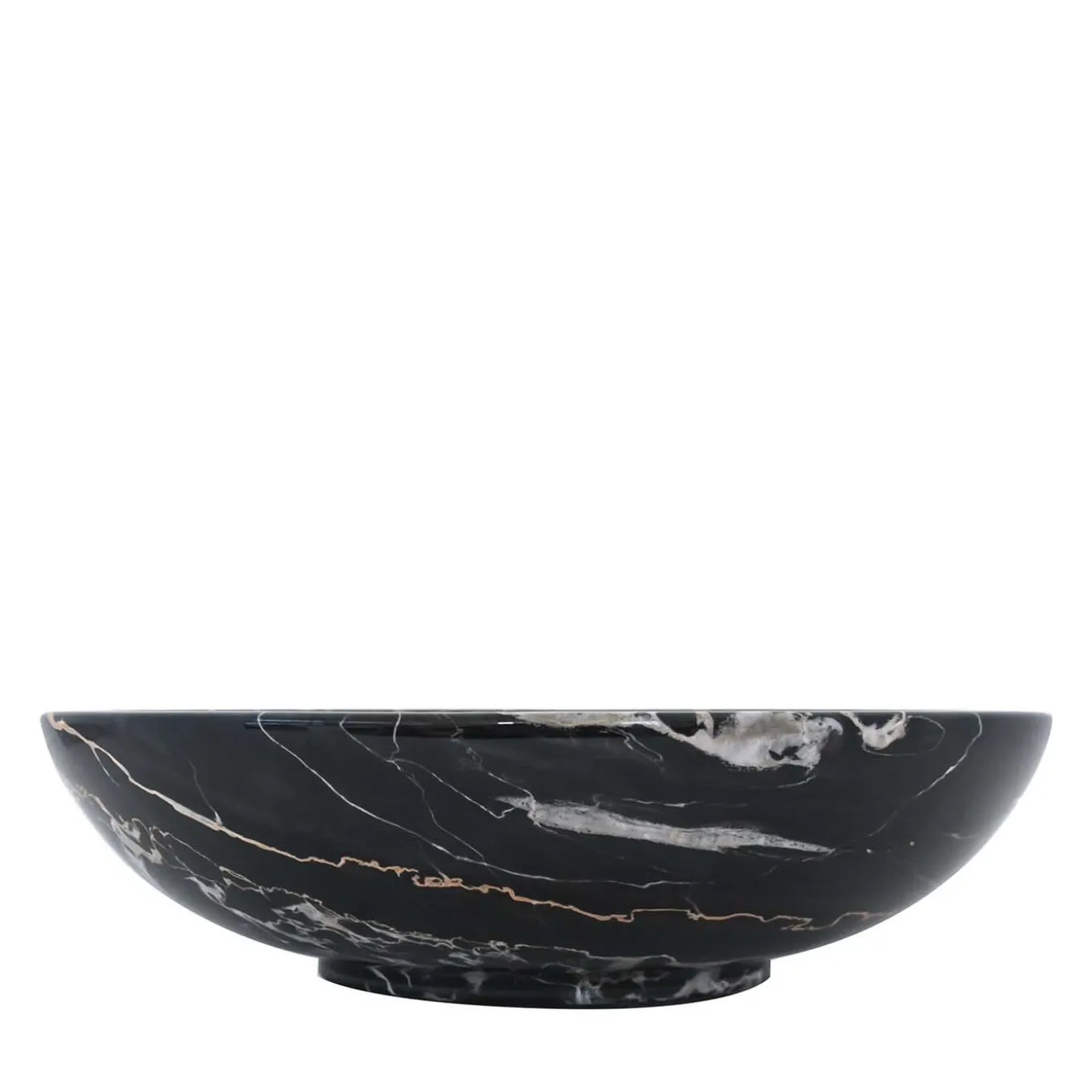 The simple and elegant lines marking this fruit bowl are ennobled by the use of black Portoro marble. The concave, rounded silhouette boasts white veins all over, which lend the piece its unmistakable aesthetic of high visual impact. This precious fruit bowl is a must-have for sophisticated contemporary tableware sets.