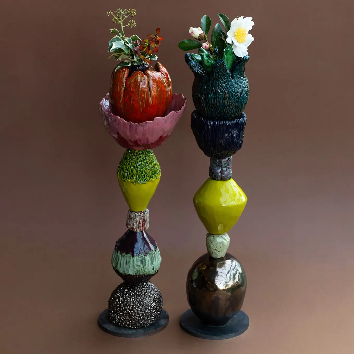 These ceramic sculptures are crafted from individually fired elements, each carefully considered before being perfectly placed. Stacked on an iron base for balance, every piece is hand-built and hand-decorated, ensuring uniqueness. Often topped with a giant bloom or seed that can hold flowers, the collection unites contrasts: polished and rough textures, fluid and geometric shapes, bold and soft tones. The bloom’s dynamic movement contrasts with the sculpture’s serene stillness.