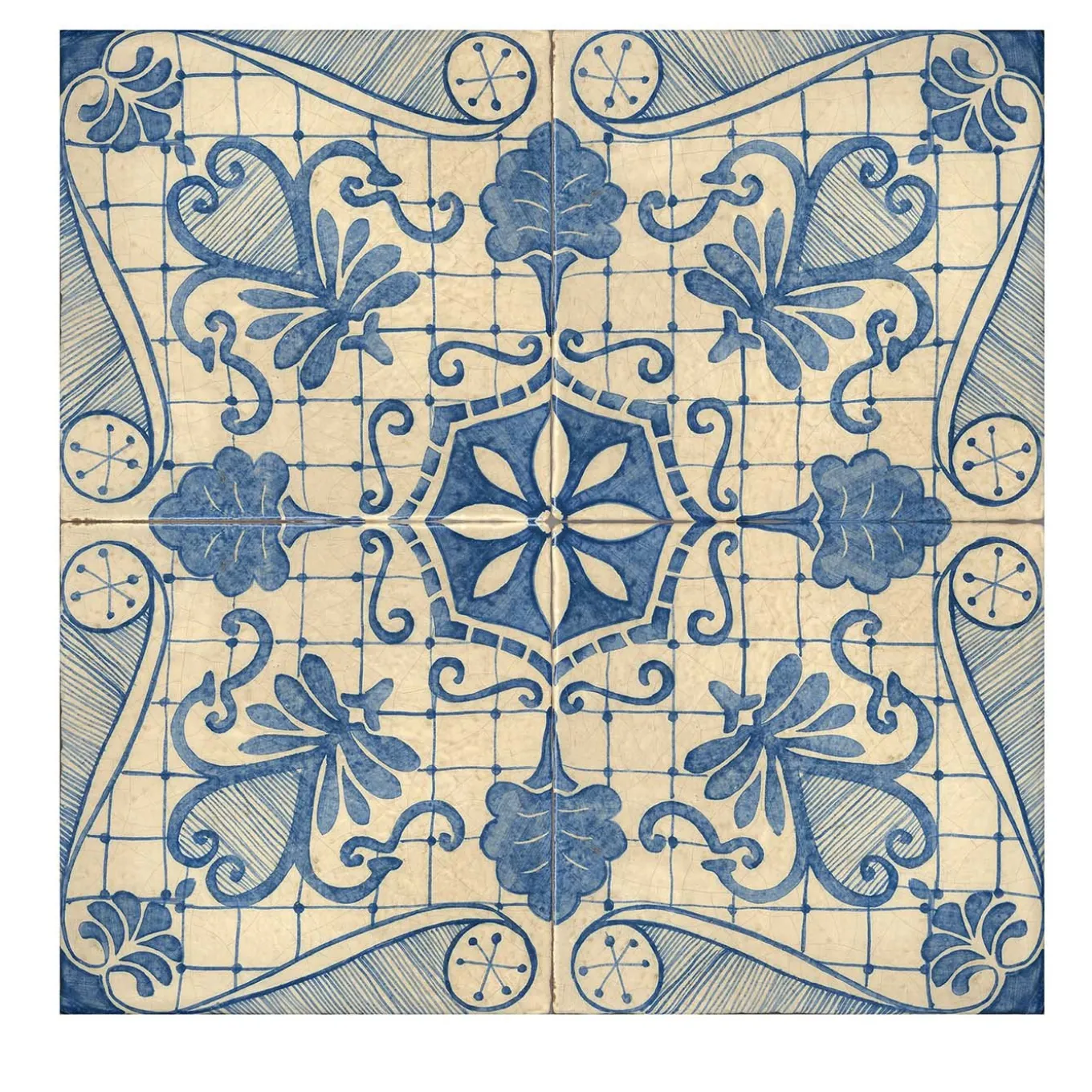 An exercise in fluidity and visual harmony, these ornamental, majolica tiles will be a striking statement piece in a traditional interior decor. Distinguished by a meticulously handmade production, these superb tiles feature an intricate, Moorish-inspired design. Revealed in four tiles, the design features frond-like motifs in a deep cerulean blue radiating from a central stylized flower. An undulating, bell-shaped border frames the design while an underlying grid enhances its subtle geometry. These tiles must be applied with minimal grouting to ensure design continuity.
