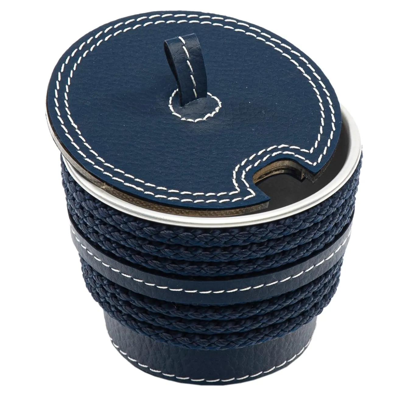 A bold yet fresh look defines this sugar bowl, a design whose tailored quality and decorative detailing suggest its complement to exclusive boat settings. Blue-hued faux leather covers the aluminum body and the round lip, where a cutout detail allows to keep the spoon always in place and at hand. Rows of color-coordinated ropes reveal that unmistakable nautical style that is Marricreo’s trademark.
