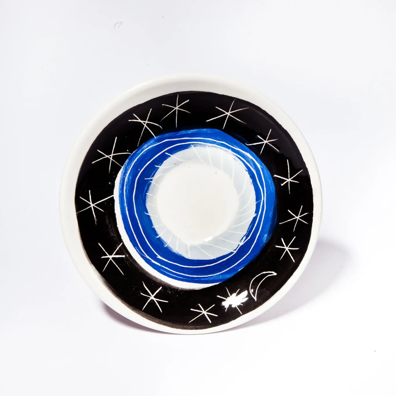 Part of a series inspired by medieval collections of real and fantastical creatures and by the paintings on the ceilings of Egyptians pyramids, this set of espresso cup and saucer was entirely hand painted over a clay surface with a glazed finish. On the white background of the cup (Ø8 cm, H 4.5 cm), the artist used the typical colors of the traditional “engobbio” technique (light grey, blue, and black) to create the playfully eclectic portrait of a horse striking its tongue out of its mouth. The saucer (Ø12 cm) is adorned with an eclectic rendition of a starry sky.