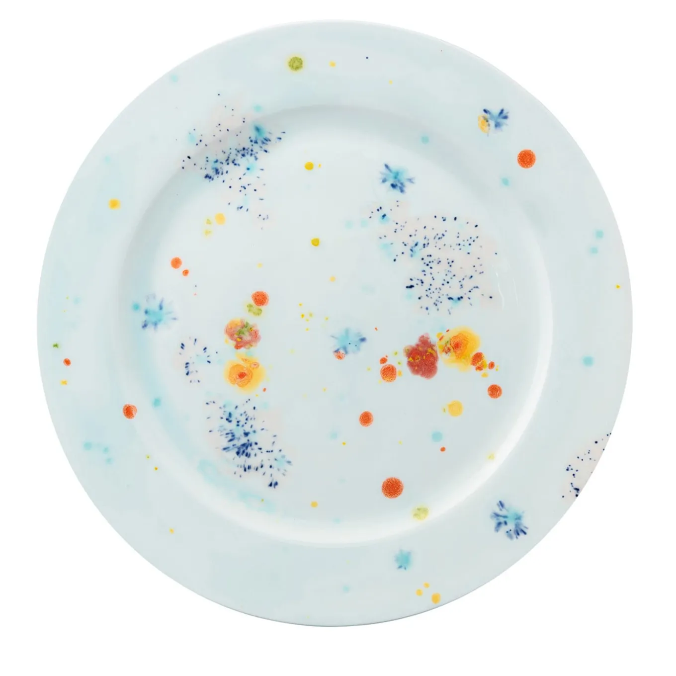Delicate circles in light blue adorn the background of this stunning charger, dotted with a myriad of multi-colored spots that evoke in a poetic and modern way the many mysteries of marine life. This piece will enliven an elegant table, thanks to its exquisite hand-craftsmanship and the use of fine porcelain as the backdrop for a modern design. Part of the Corallo Collection introduced at Milan Design Week in 2018, this charger can be displayed with the other pieces of the same series for a cohesive look. Dishwasher safe.