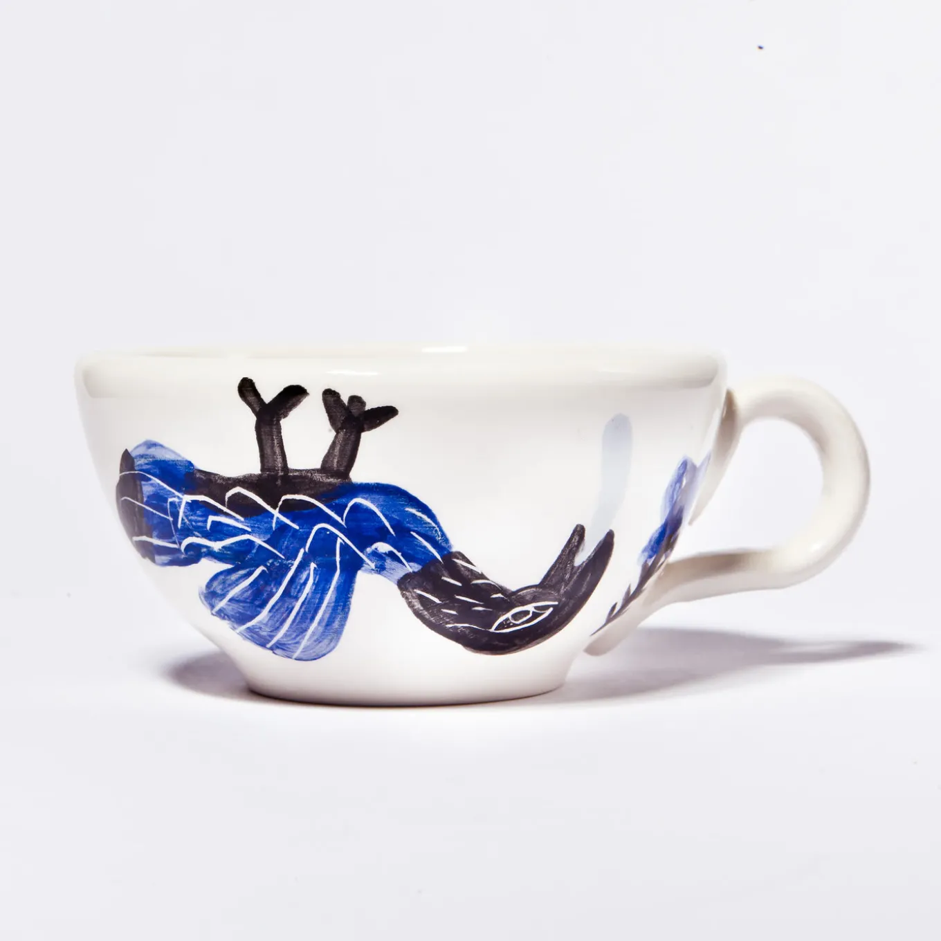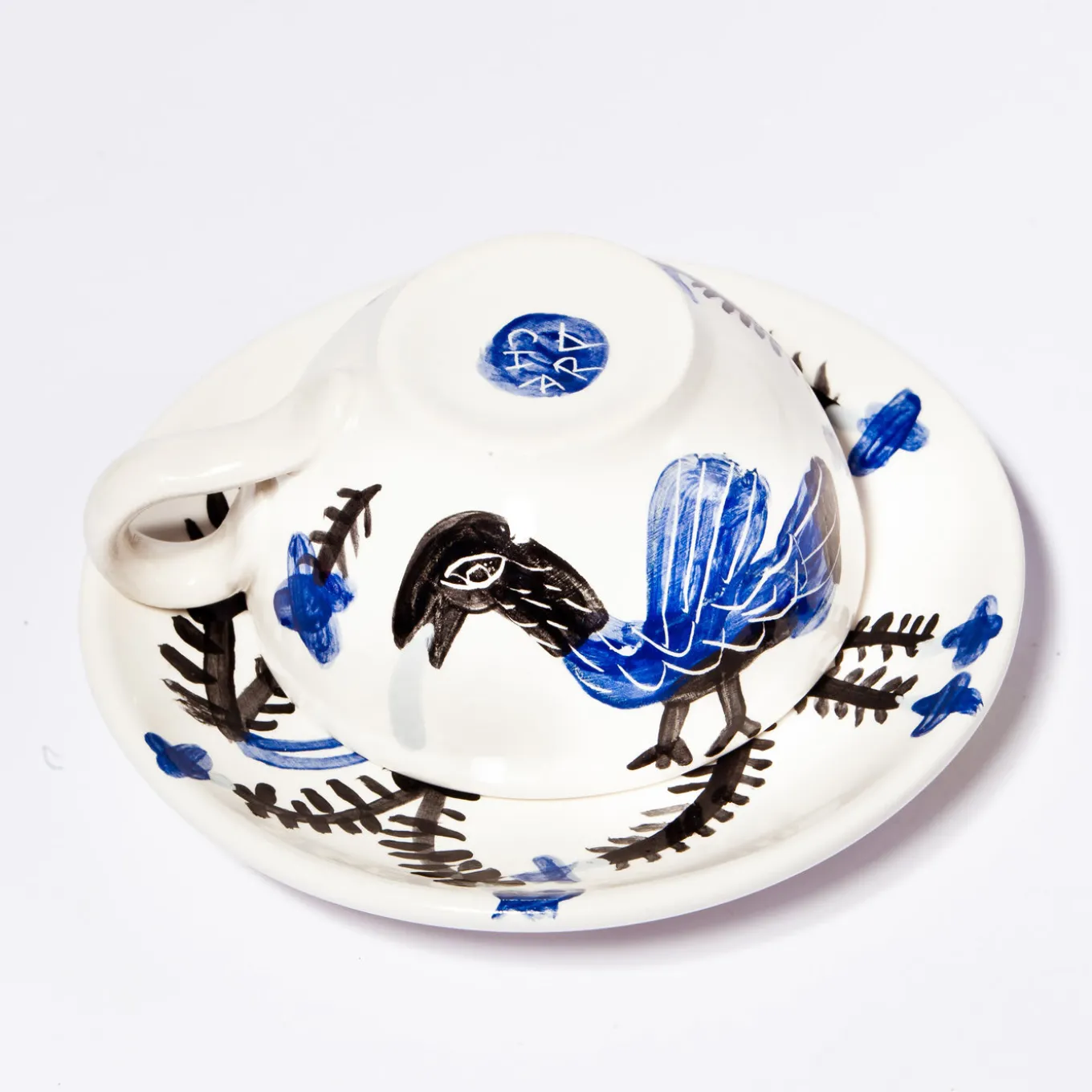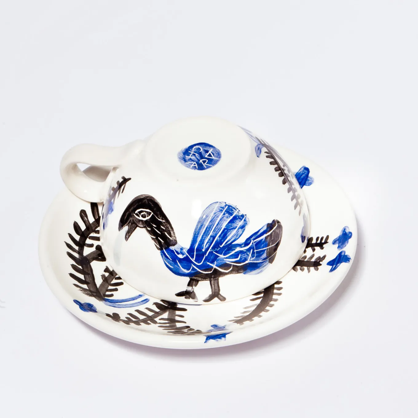 Part of the Blue Bird & Myosotis collection, this handprinted set of espresso cup (Ø8 cm, H 4.5 cm) and saucer (Ø12 cm) will add a lively and colorful accent to an eclectic or modern interior. Its white glazed surface is decorated using the “engobbio” technique with black, blue, and light grey colors. This stunning work of art is unique and can be combined with the others in the same series for a complete look. Its eclectic design was inspired by the artist’s love for Medieval iconography, by a manuscript about herbs published around 1350-1375 in Northern Italy and entitled “Compendium Salernitanum,” and J.L. Borges “The Book of Imaginary Beings.”