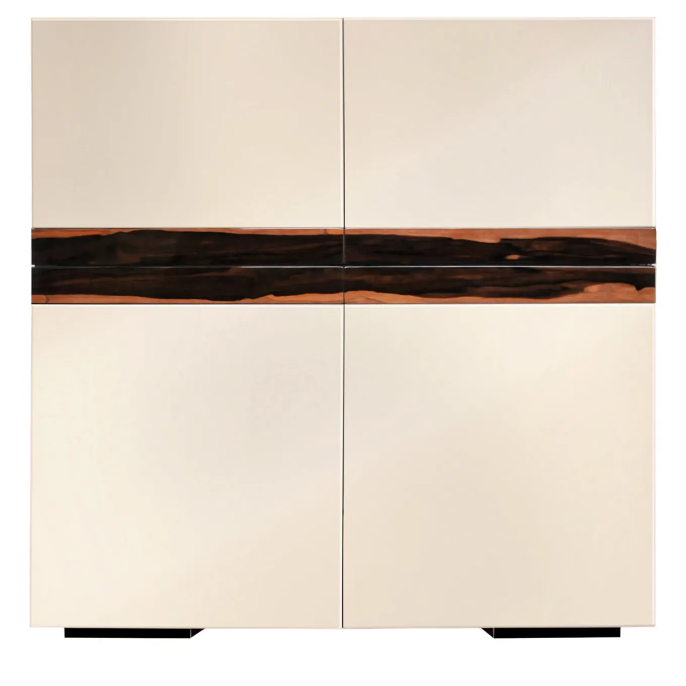 This striking bar cabinet will create a singular focal point in a modern living or dining room, infusing it with unparalleled sophistication. Lacquered in a cream polished polyurethane ink, the structure features four doors enriched with a refined central board in Makassar ebony. Lined with elegant dark stained mirrors, it features a chromed pull-out drawer for bar accessories and glassware. Illuminated with LED lights, it is available for customizations, please ask the Concierge for further details and options.