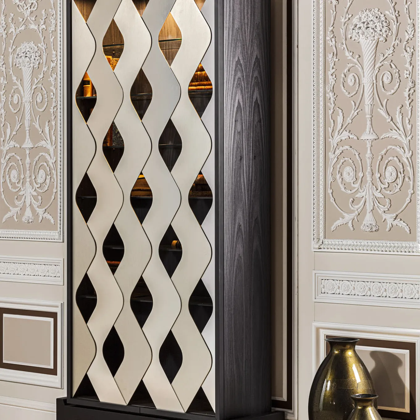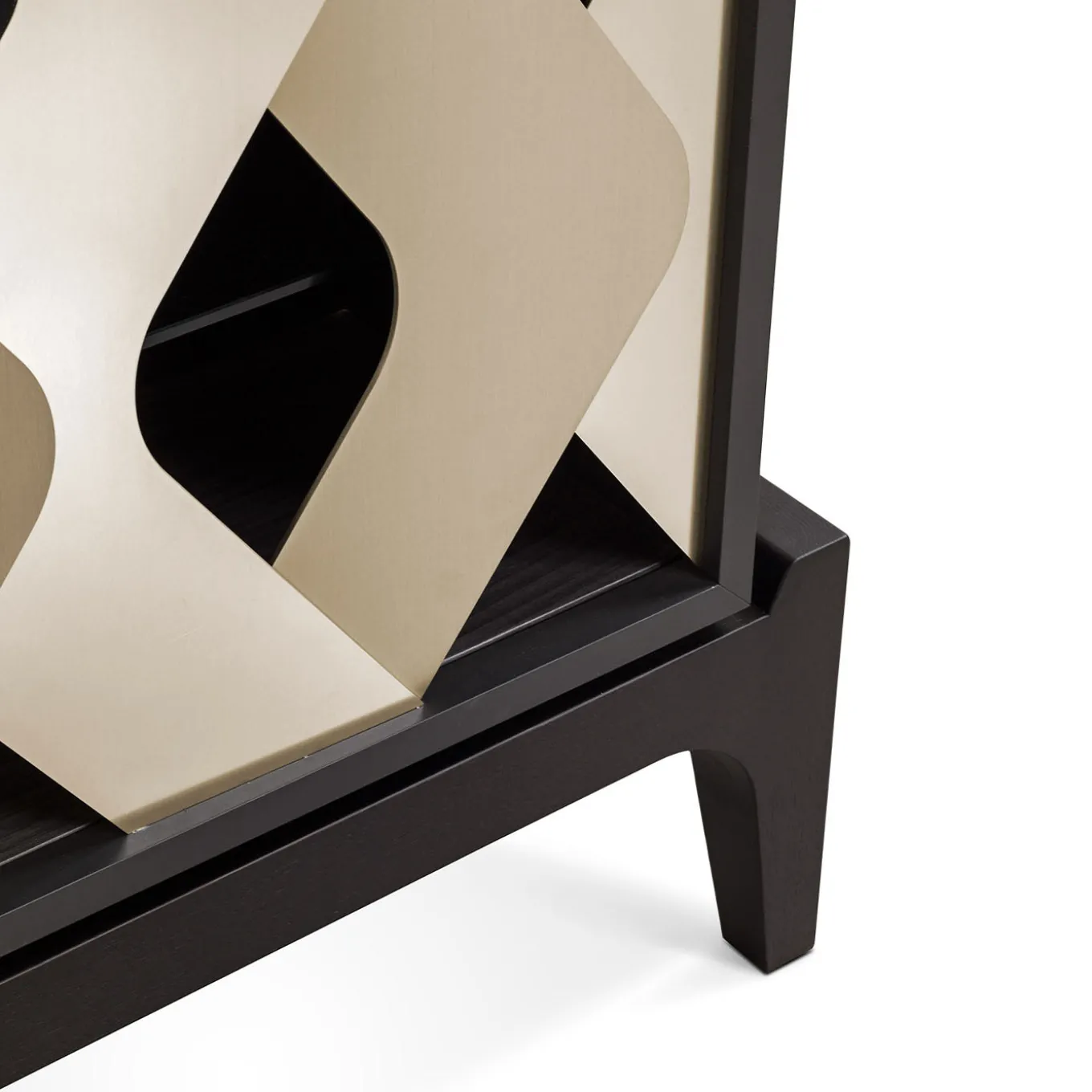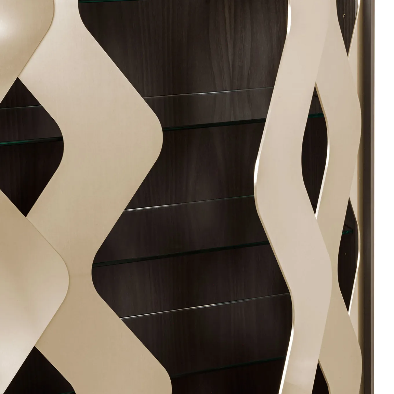 Bolivar wood cabinet with oak base and wave-shaped doors in galvanized aluminum.