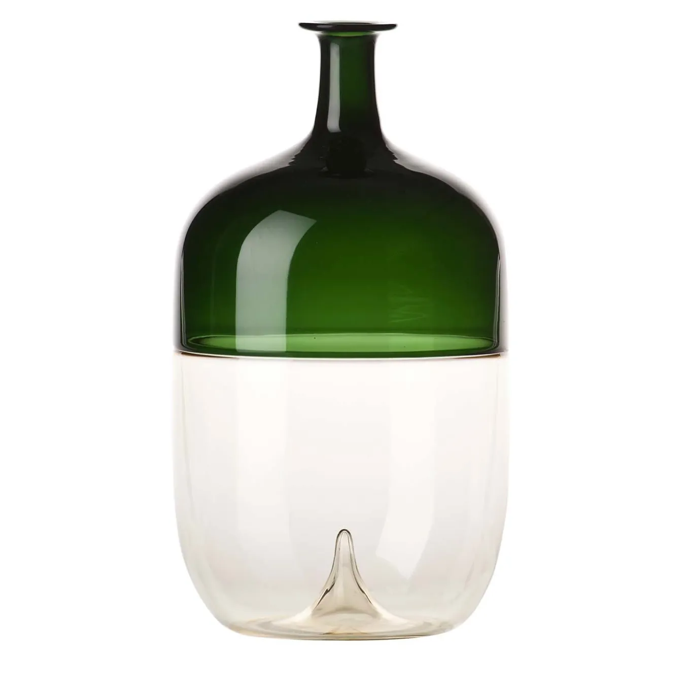 This blown-glass vase is an exclusive design by Tapio Wirkkala for Venini. This elegant piece is handmade with the “incalmo” technique, whereby the green top and pale yellow bottom are masterfully fused together while the glass is still hot to form a single bi-color piece. It is available in other colors and sizes.