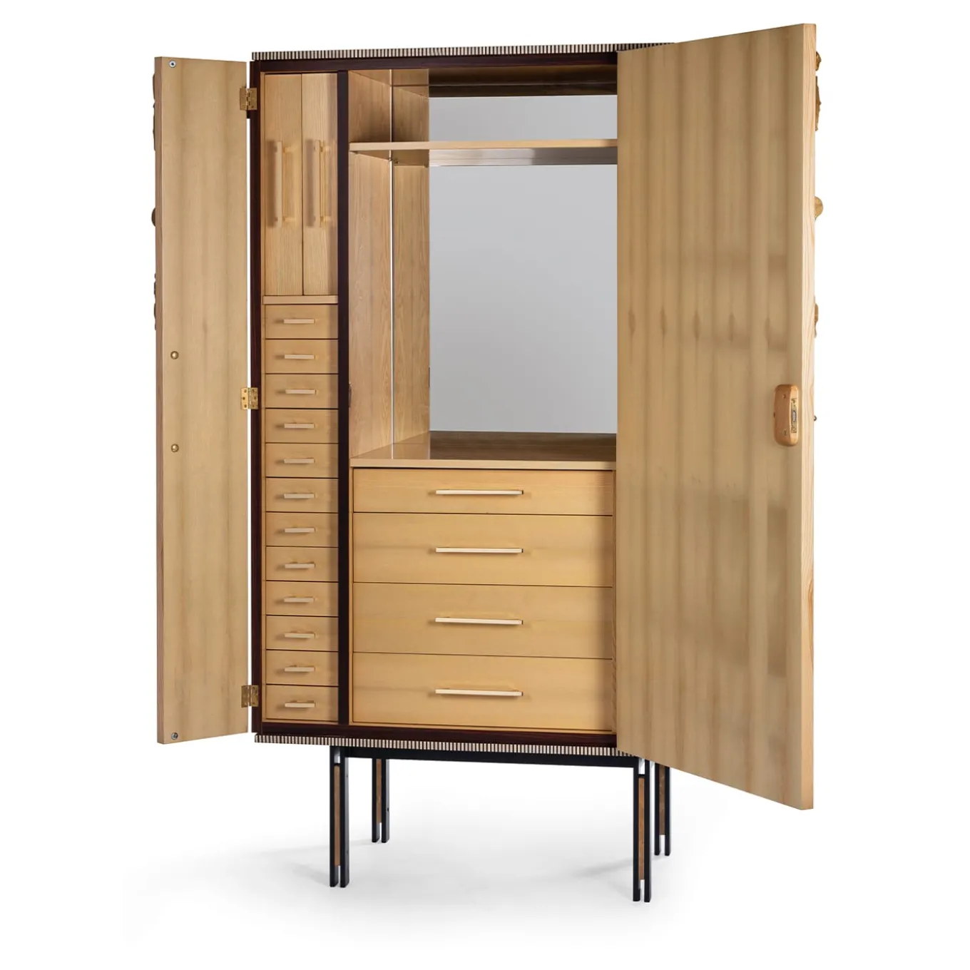 The contemporary theme of becoming, where changes do not signify a loss of identity but positive evolution, inspires the cabinet Bon Sai whose stylistic references are oriented towards the 20th century. The branch shaped inlay reminds of a bonsai tree, symbol of a man-made constant change. This high sideboard is made of ash inlaid with bleached erable, ebony and gold leaf. The legs are made of brushed black iron and the details of solid bronze. Customizable interior design with shelves or drawers.