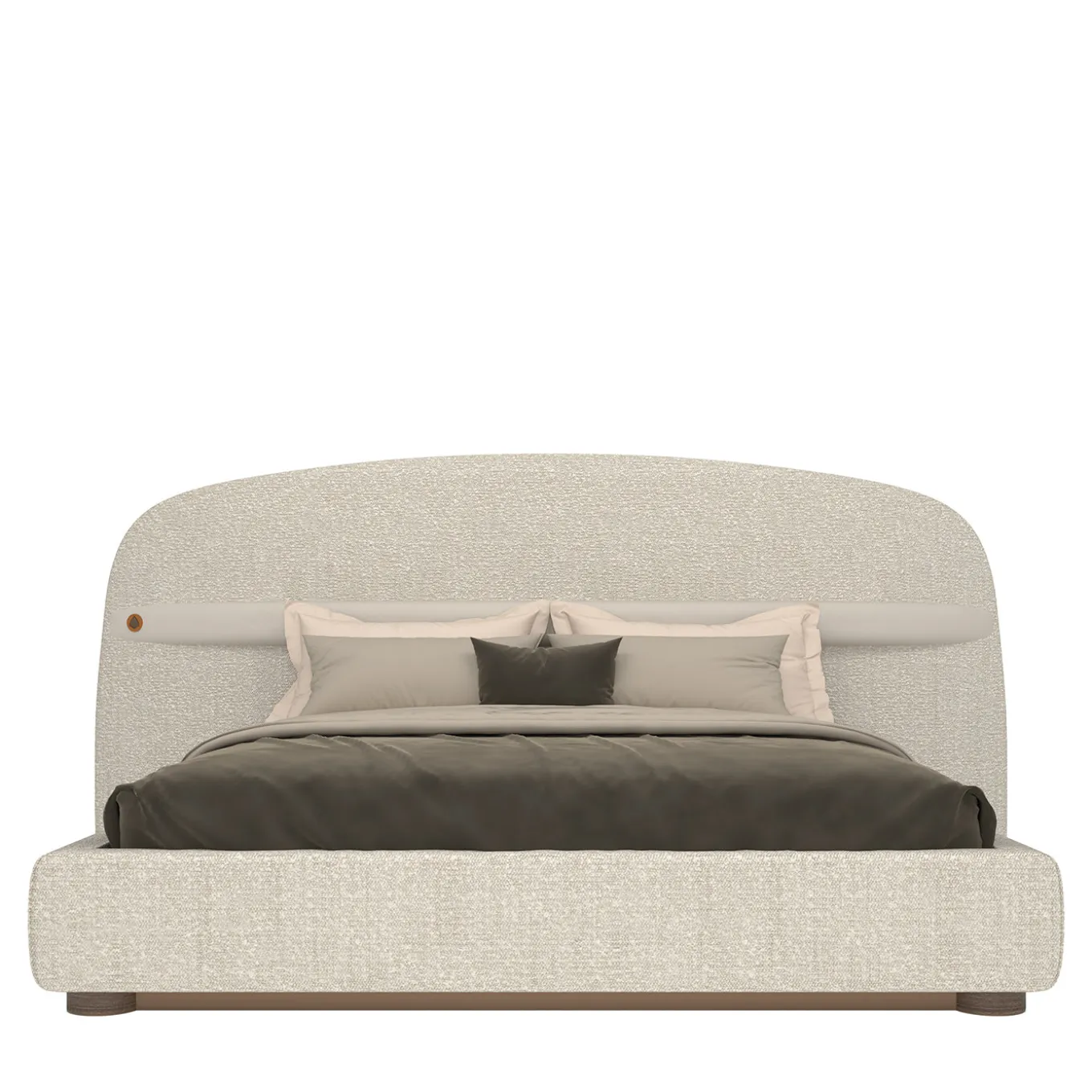 The Bon Ton bed features a rounded headboard upholstered in fabric or leather, enhanced by a distinctive horizontal metal strip detail. Its base comprises three sections with exposed metal corners, facilitating easy transport and assembly via bayonet joints. The structure includes a metal base and a wood frame cushioned with polyurethane foam. Options include a fixed slatted base or a storage compartment with one or two movements to level the mattress, with a fabric-lined wooden floor branded Living Couture. Mattress size is 180 x 200 cm in the medium version. All finishes, including metals, leathers, and fabrics, are available upon request – for further information please contact the concierge.
