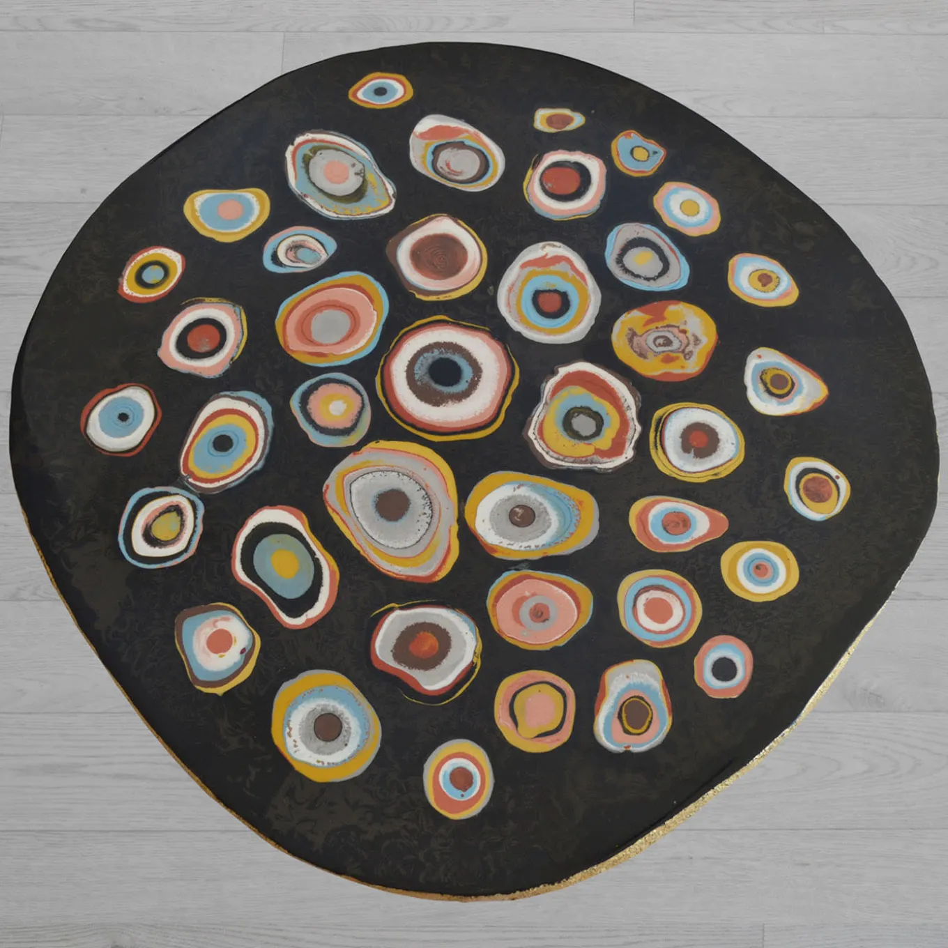 Brimming with the allure of an objet d’art, this coffee table from the BonBon Collection is an ode to the spontaneous elegance of irregular profiles enlivened by vibrant and eccentric patterns. A warm golden tone accents the coarse sides, while the black top hypnotizes with its colorful dots reminiscent of precious murrinas from Murano glass artworks. Every piece is carefully handmade and unrepeatable.