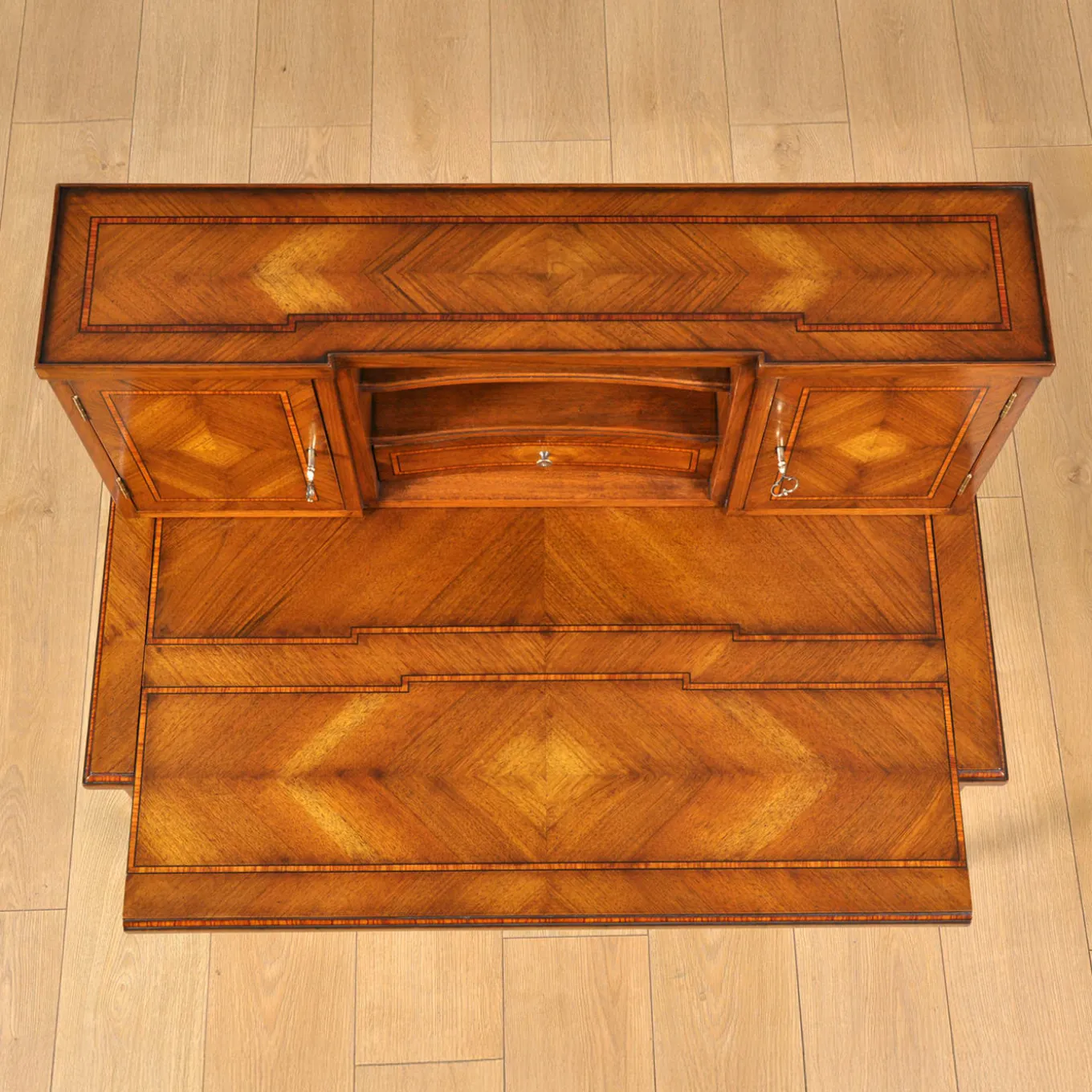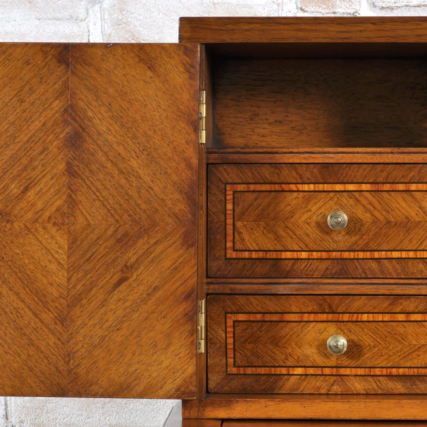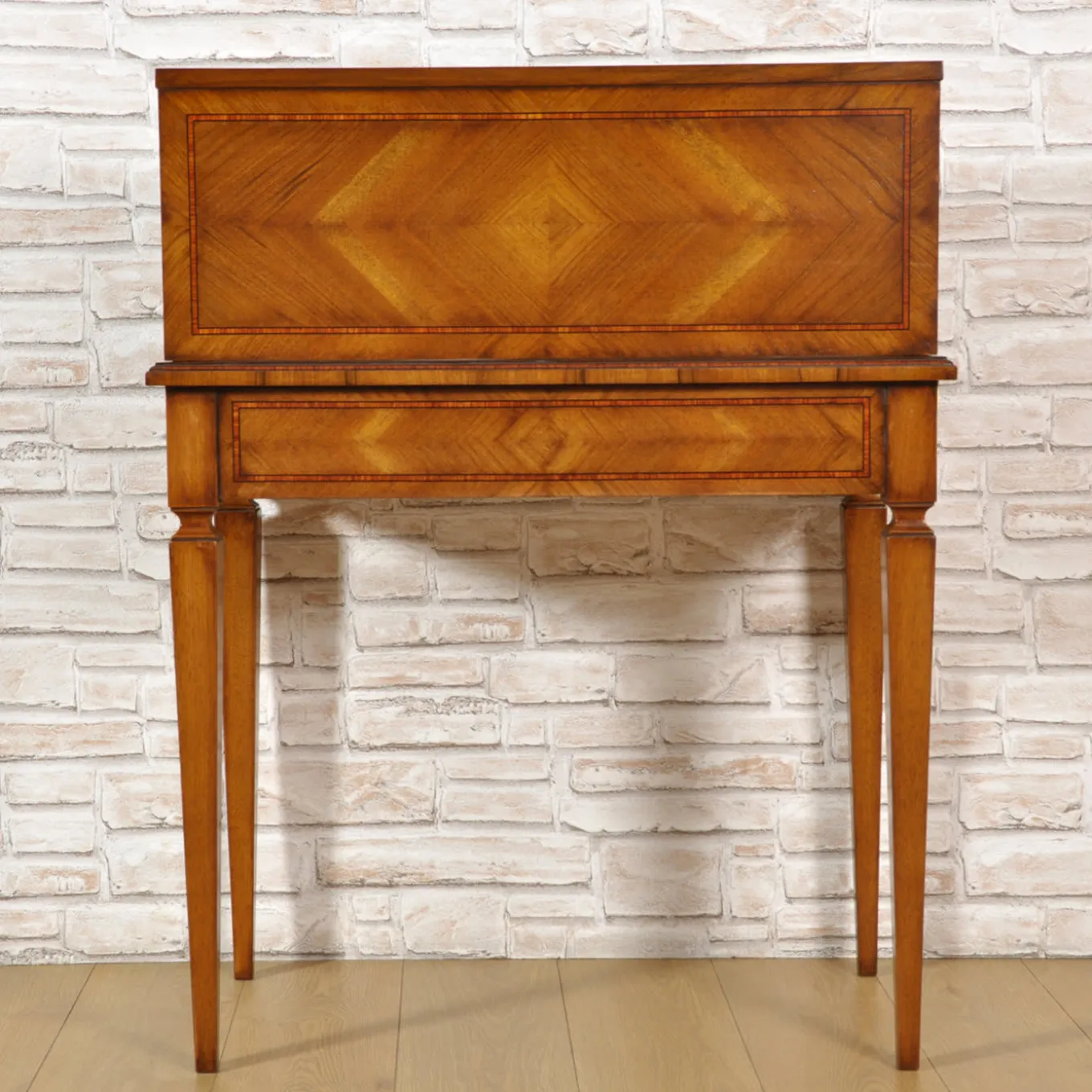 Bonher-du-jour features a refined Louis XVI style with a central unit comprising a small cabinet with two side doors concealing five secret drawers. The hand-inlaid walnut showcases a distinctive herringbone pattern with maple and bois de rose accents. Supported by four tapered legs, the desk is finished with a hand-applied shellac varnish. Solid brass handles, cast and chiseled, enhance the elegant aesthetic, making it a distinguished centerpiece for any room.