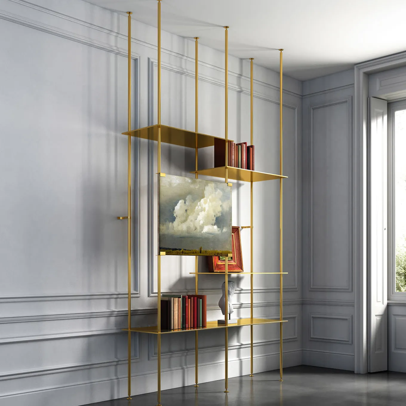 Lightweight and luminous best define the character of this floor-to-ceiling bookcase in polished brass, whose asymmetrical design has no visible joints. The final height of the design will be determined by the height of the room where it will be placed as the piece is made-to-order. A separate element allowing an easy wall mounting of the bookcase is included.