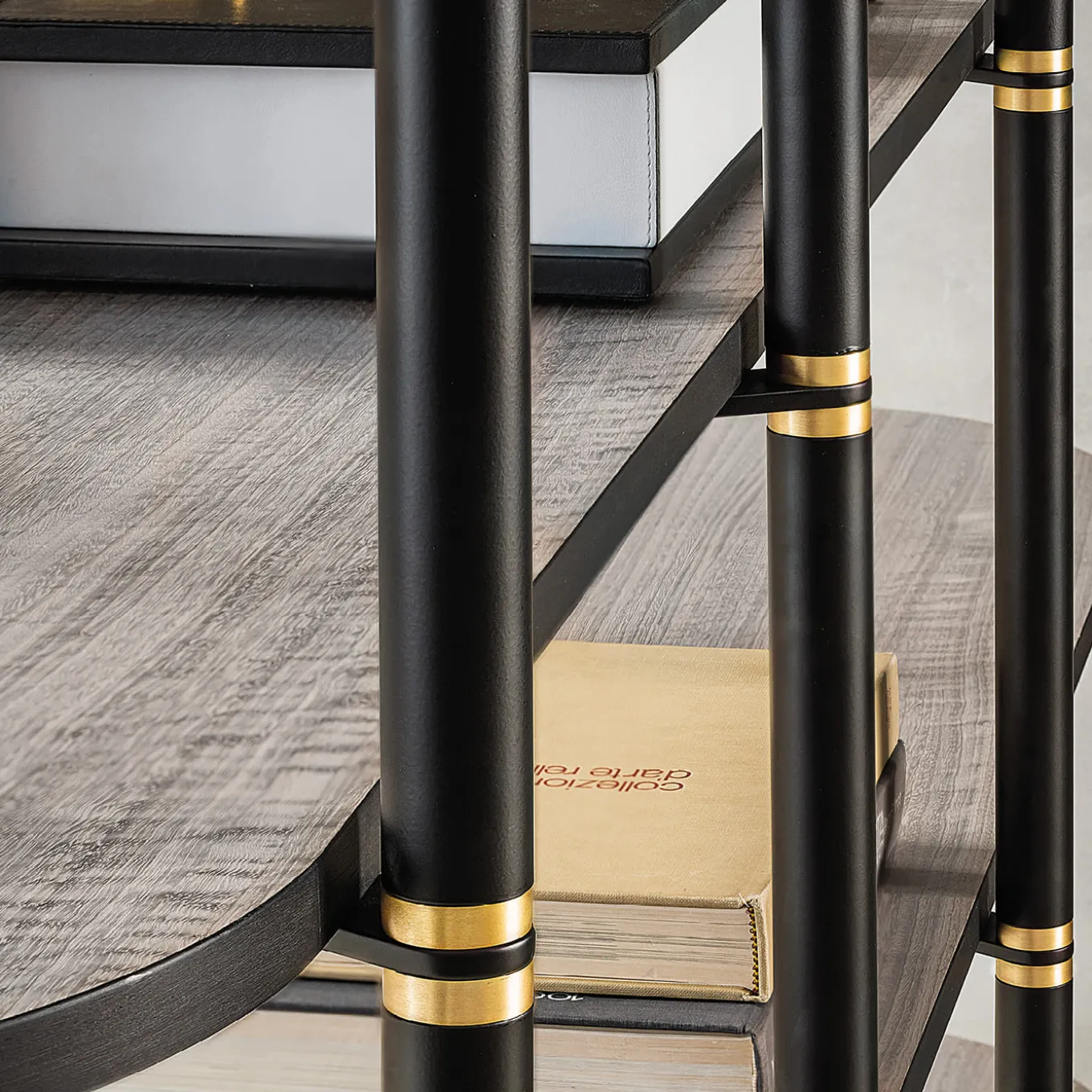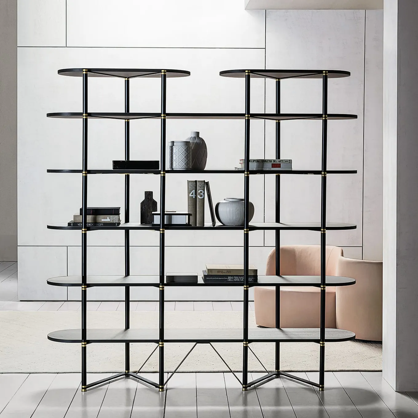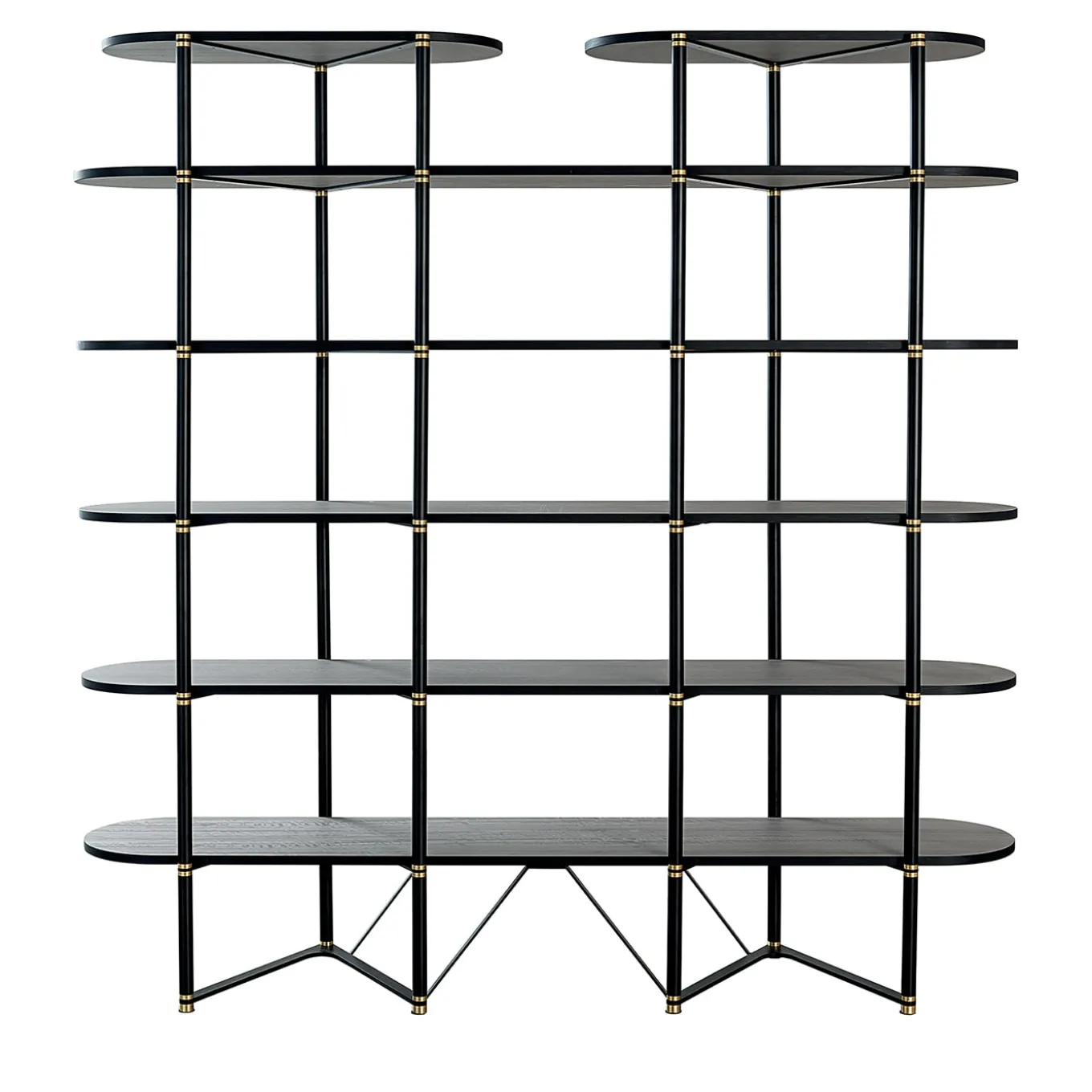 The bookshelf features a matte black painted metal frame with elegant brass details, adding a touch of sophistication. The shelves are made of particleboard panels, covered in a greige frisé eucalyptus veneer for a refined, natural look. Perfect for modern interiors, it combines industrial and organic elements, offering both style and functionality. A timeless piece for any spaces.