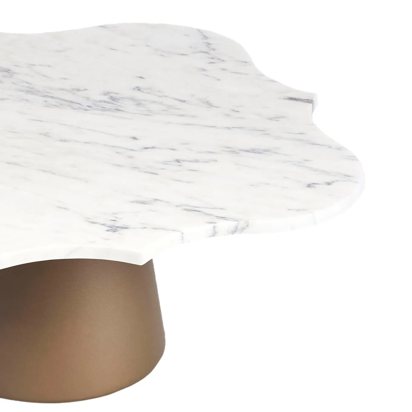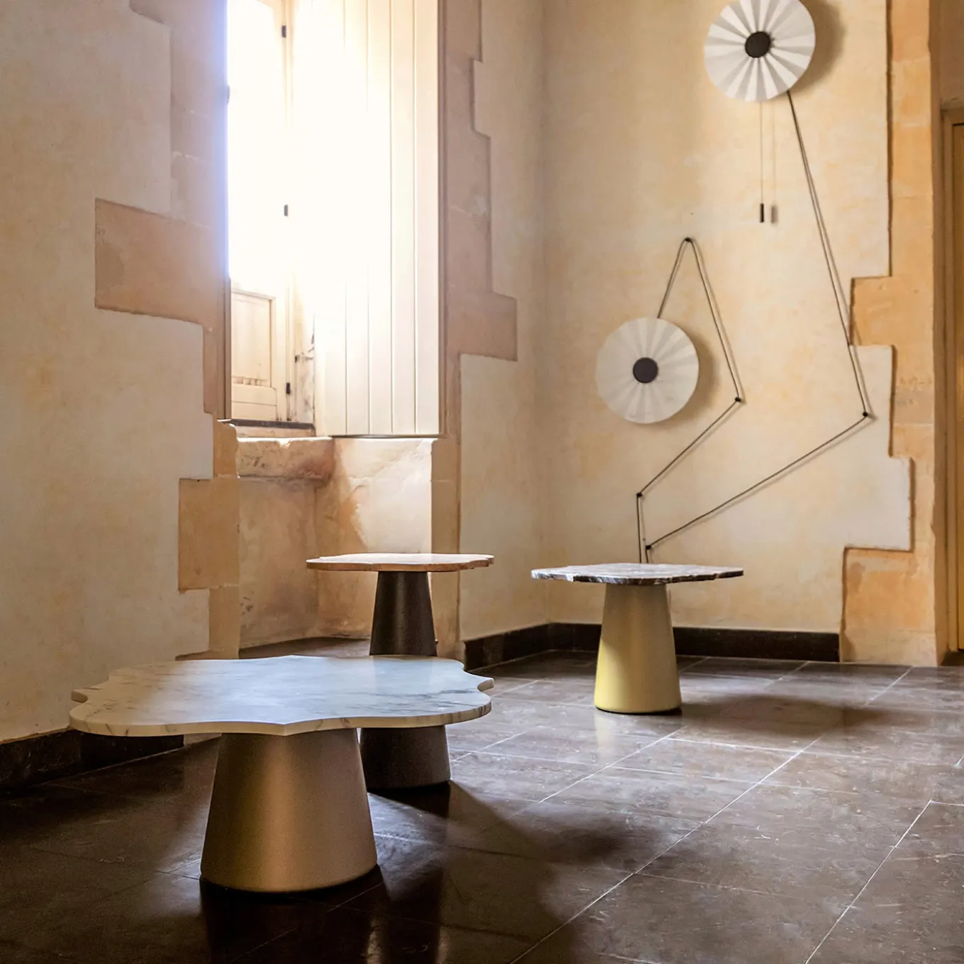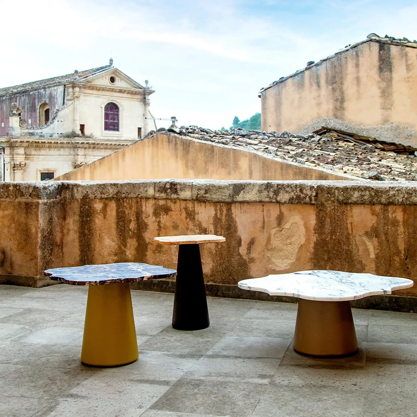 Juxtaposing elegant hues, this spectacular coffee table is designed in 2021 by designer Salvatore Spataro and is entirely handcrafted of marble. It features a sinuously lined white top and a bronze-lacquered conical base inspired by the facade of the 18th-century Baroque Church of San Carlo al Corso dedicated to San Carlo Borromeo, found in the city center of the Sicilian town of Noto.