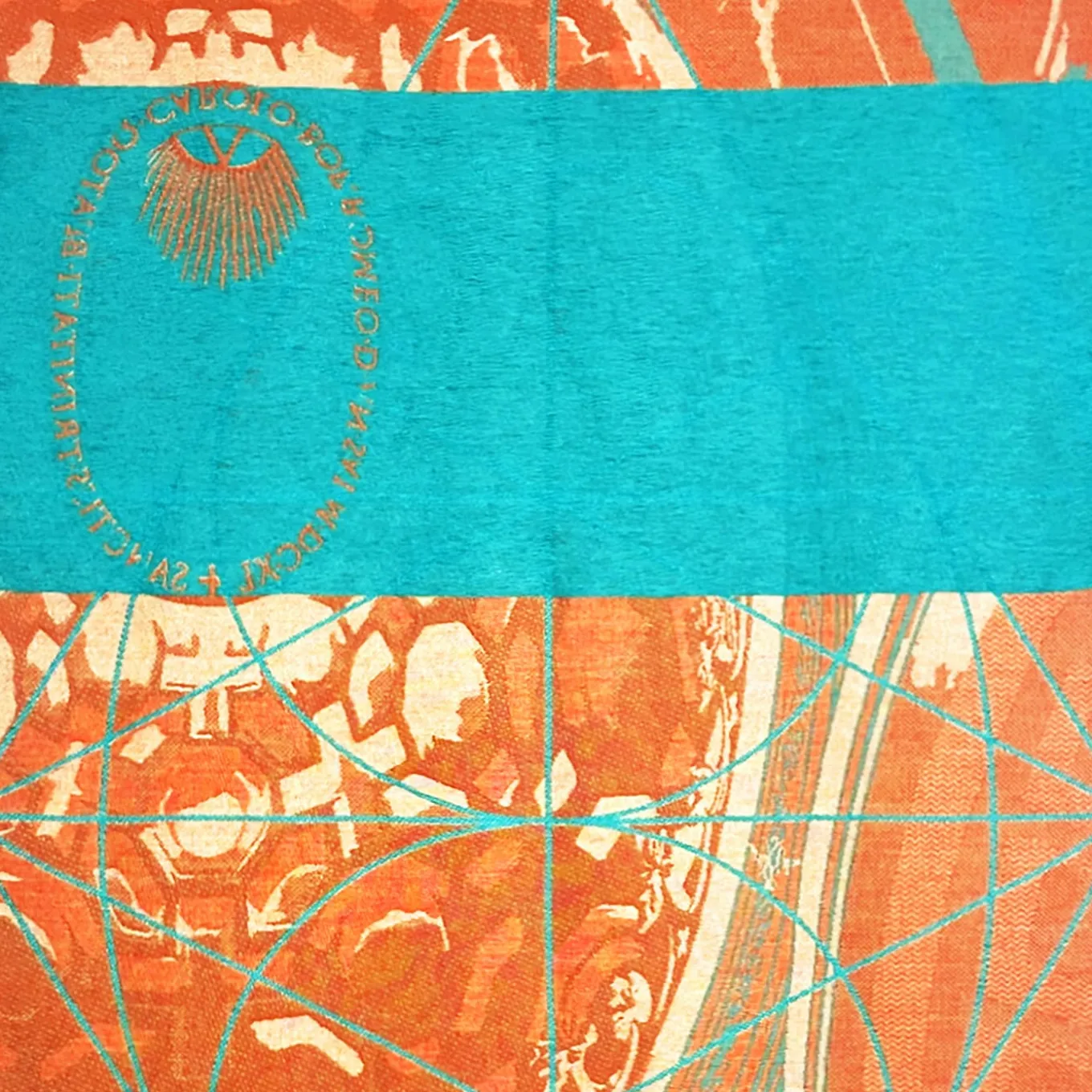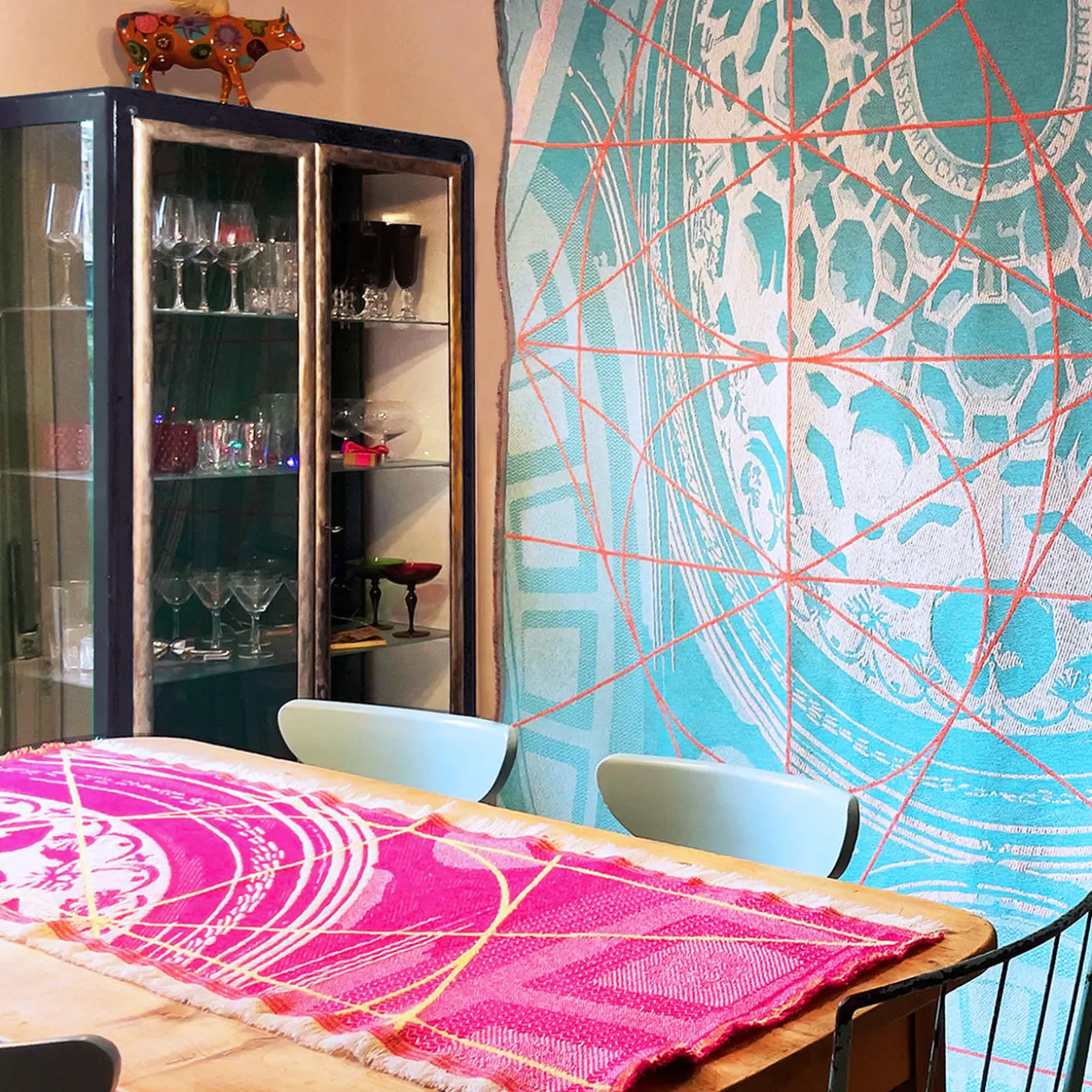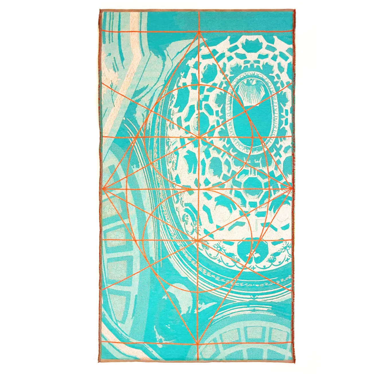 Abstract and Baroque elements are daringly combined in this precious artisan tapestry crafted in collaboration with the historic textile factory Torri Lana 1885. The milky-white warp combines with a weft of Tiffany-blue linen yarns in turn enriched with thin rusty-red inserts in cotton and wool, a composition that layers glimpses from the San Carlo alle Quattro Fontane church by Borromini with dynamic geometric lines. Please contact the Concierge for available color variants.