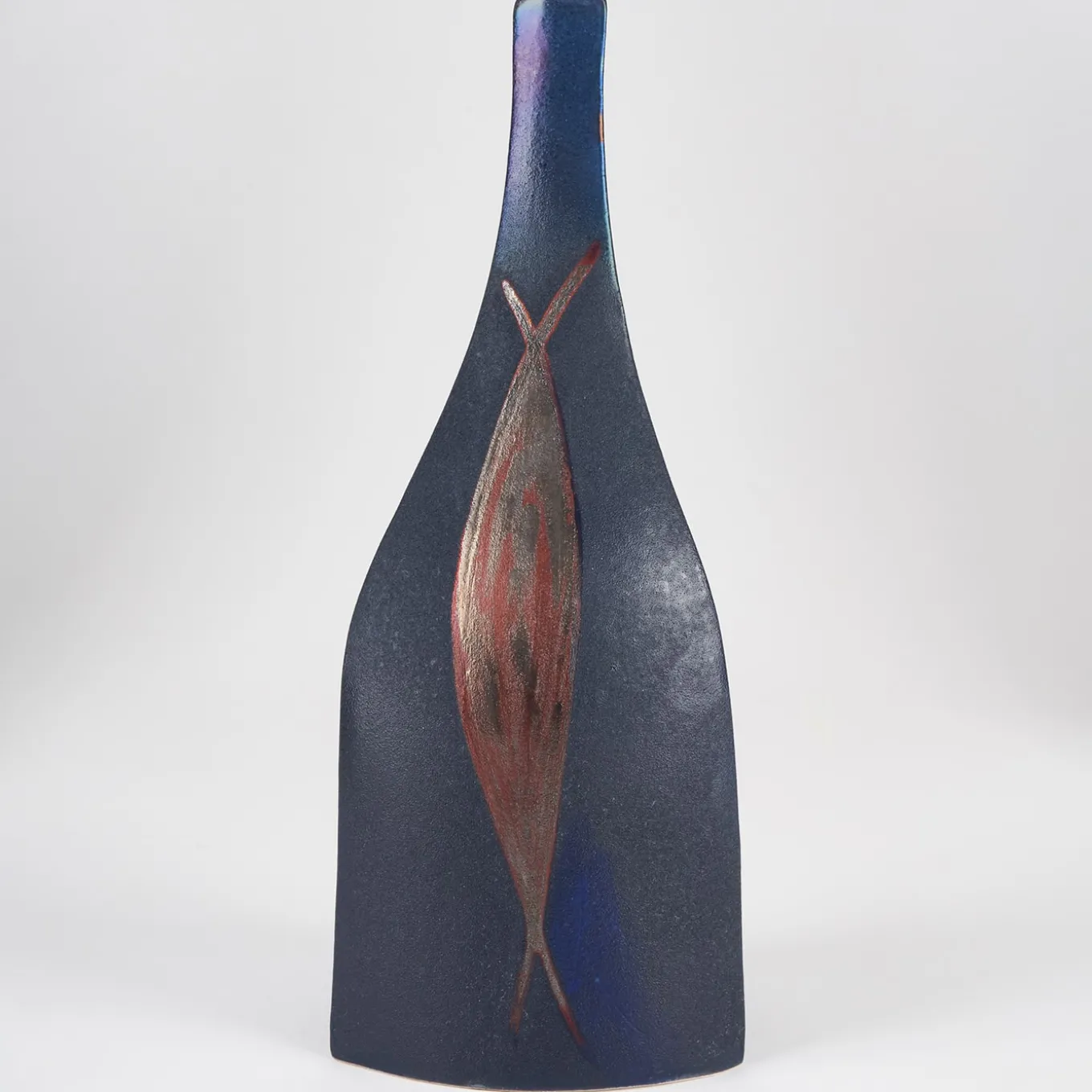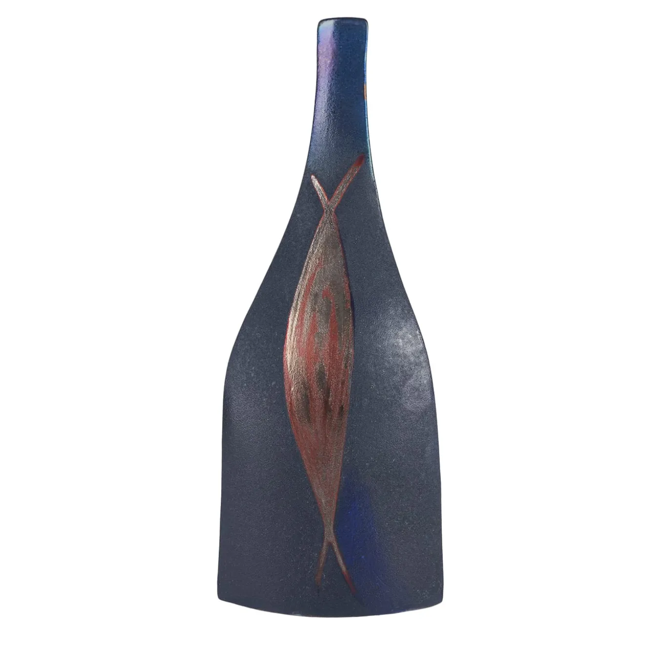 A gem of handmade pottery, this one-off bottle-shaped vase in prized faience is a clever synthesis of elegance and playfulness. Matte-blue enamel covers the surface, surrounding a slender central subject decorated with copper oxides for an intriguing range of different shades. Part of the Hug-Abbraccio Collection, it was based on a project originally developed by Carla Legs.