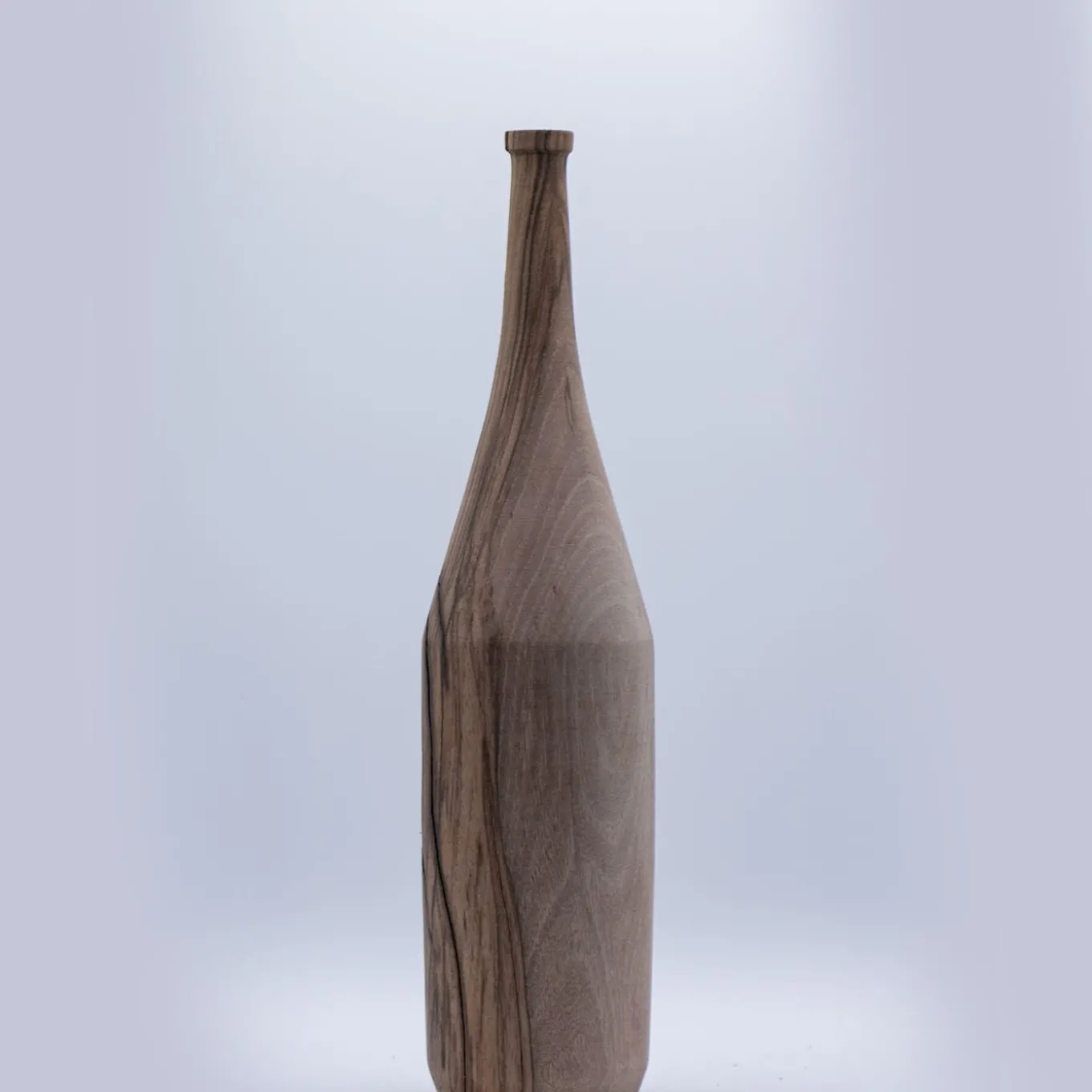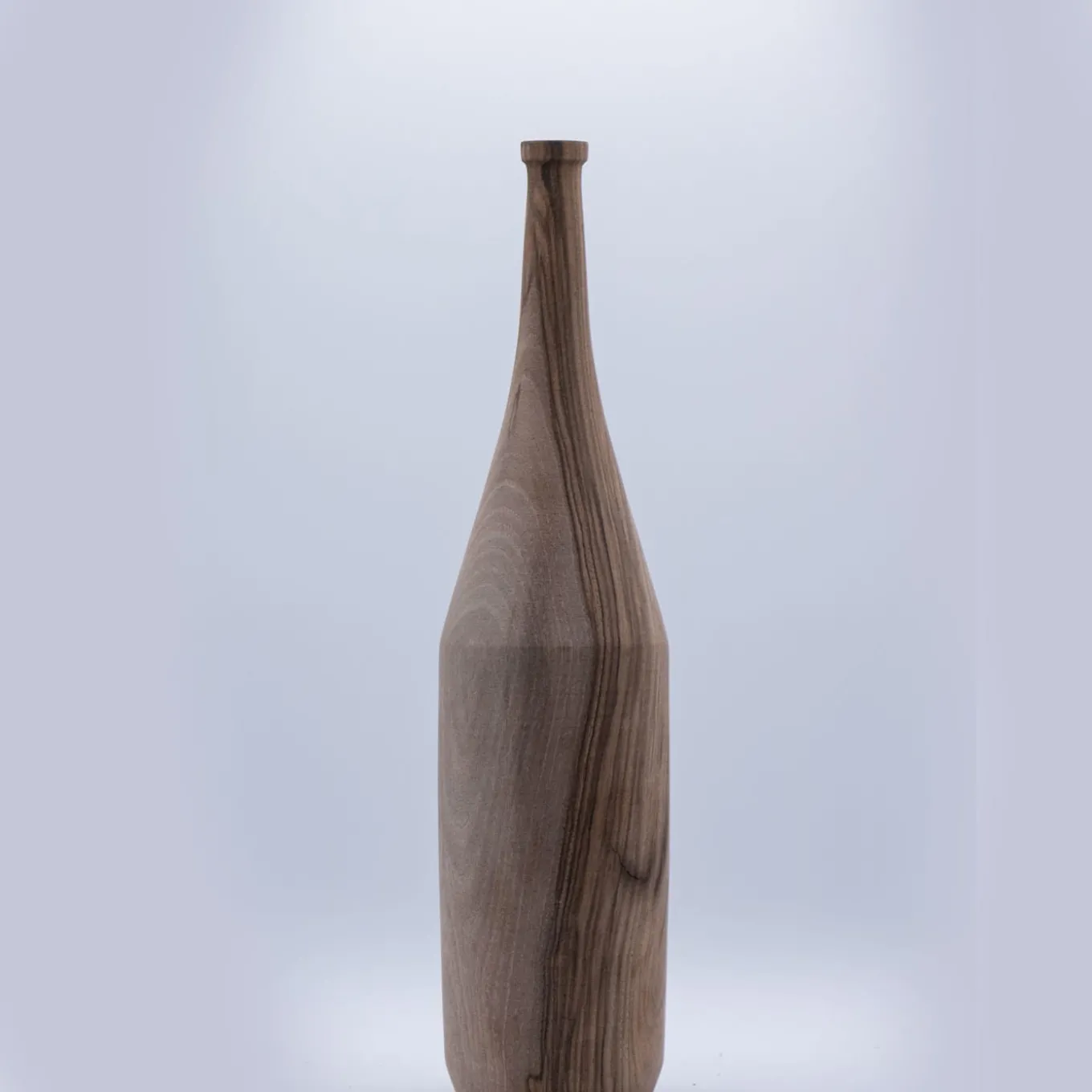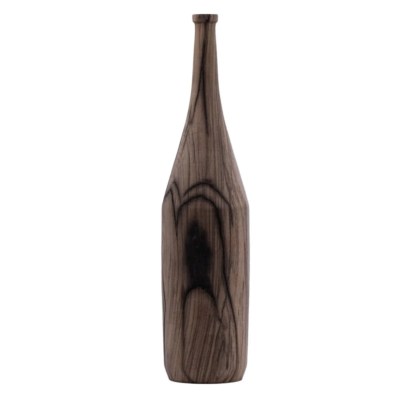 A clever interpretation of the classic bottle silhouette, this piece will become a statement piece in a rustic- or contemporary-style home. The tall silhouette with a slender neck is fashioned of walnut wood, showcasing an exceptional wood grain. The wood is treated with olive oil to seal its natural properties and prevent decay. Do not fill or immerse with water, clean only using a damp cloth.