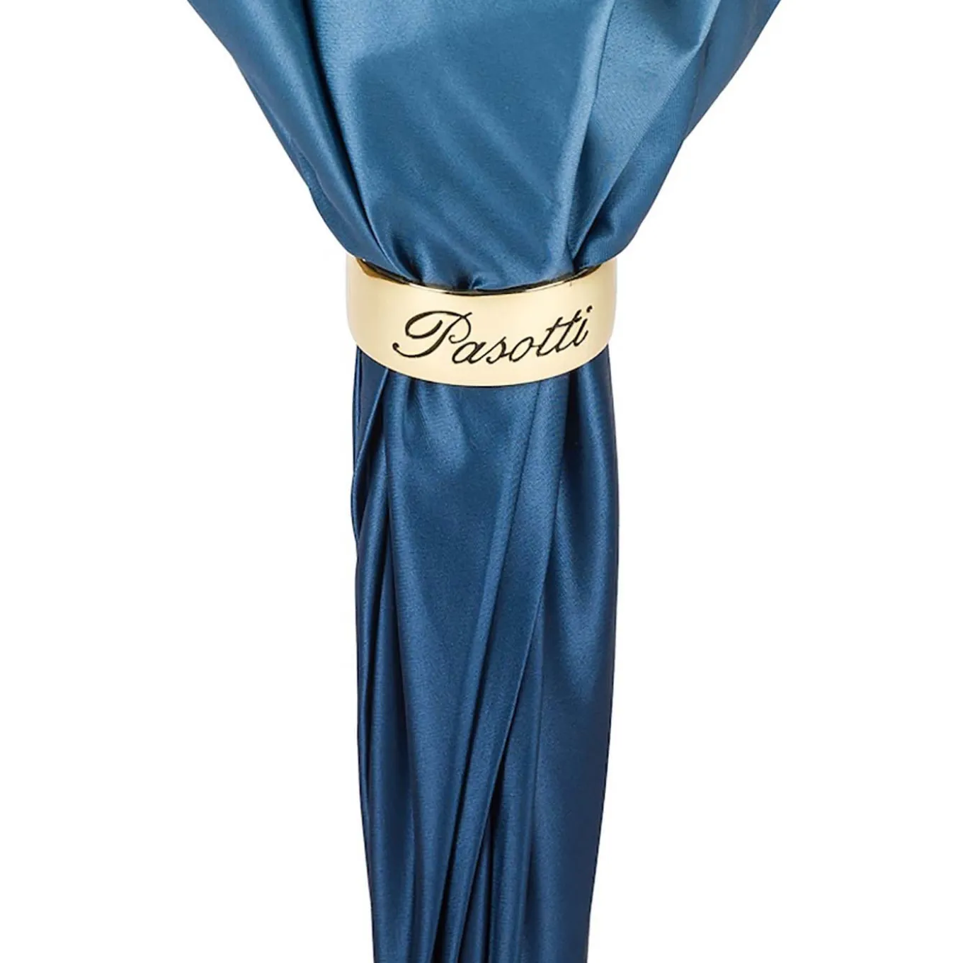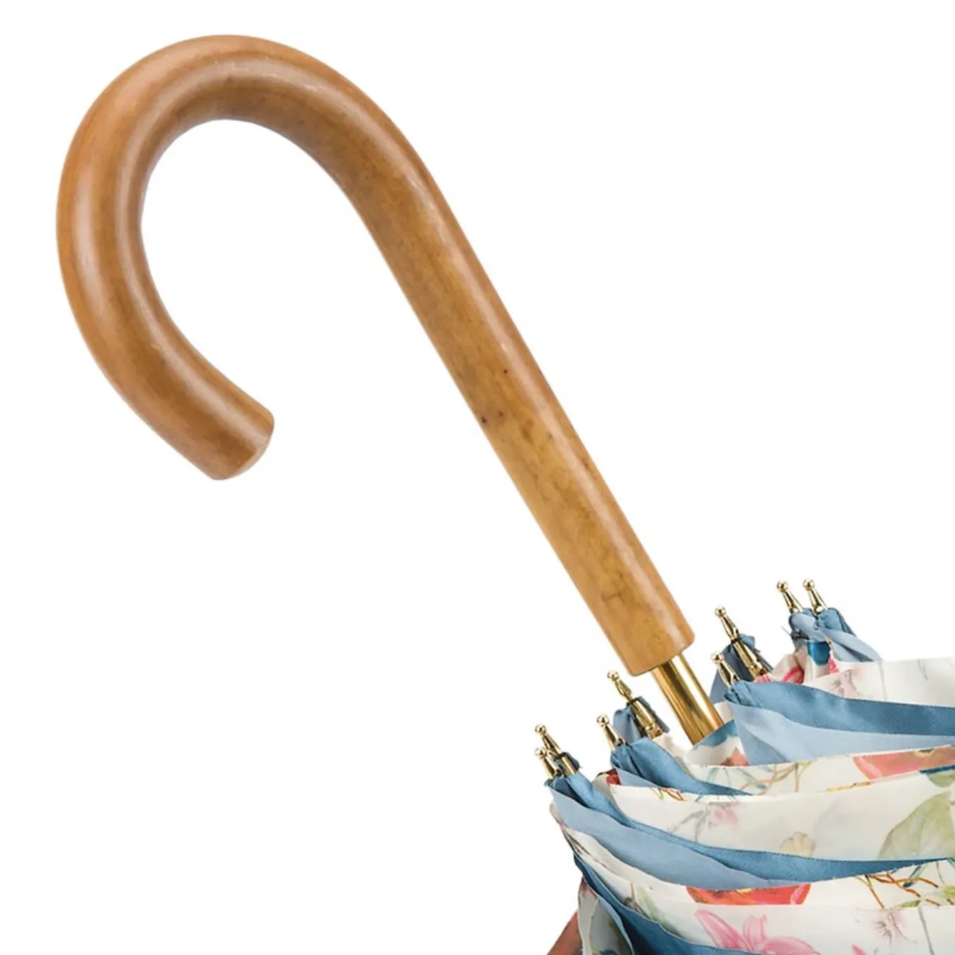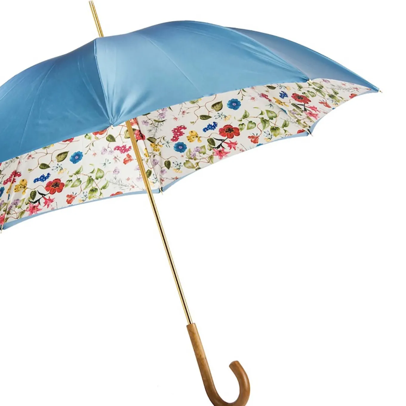 Pasotti Ombrelli offers handmade luxury fashion umbrellas with splendid designs, luxurious fabrics, creative decorations and artistic handles. Handmade in Italy, this umbrella features automatic opening and is composed of a 102-cm canopy and a 93-cm shaft. The canopy is in light blue with an interior made with a bouquet of flowers on a white background, with a simple wooden handle.