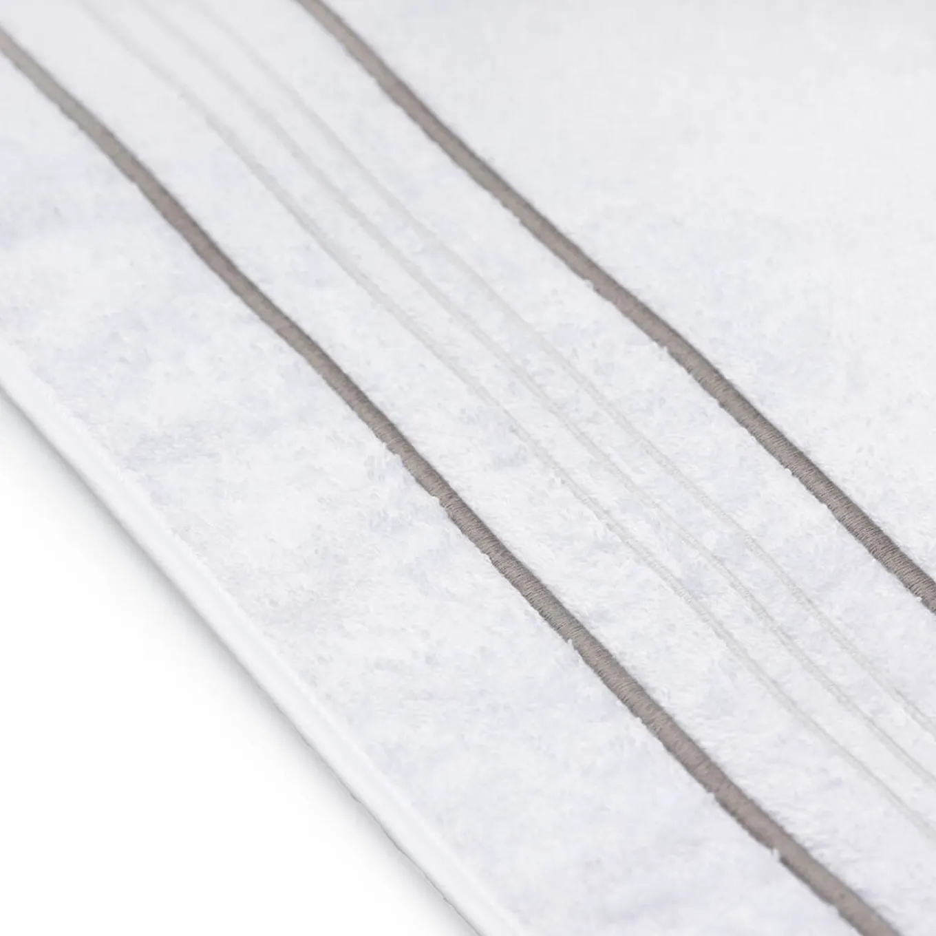 This towel set includes a bath towel, hand towel, and guest towel, featuring bias finishing with subtle embroidery on one short side. The towels come in three sizes: 40×60 cm, 60×100 cm, and 110×150 cm, designed to offer versatile use for bathroom needs while maintaining a clean, elegant appearance.