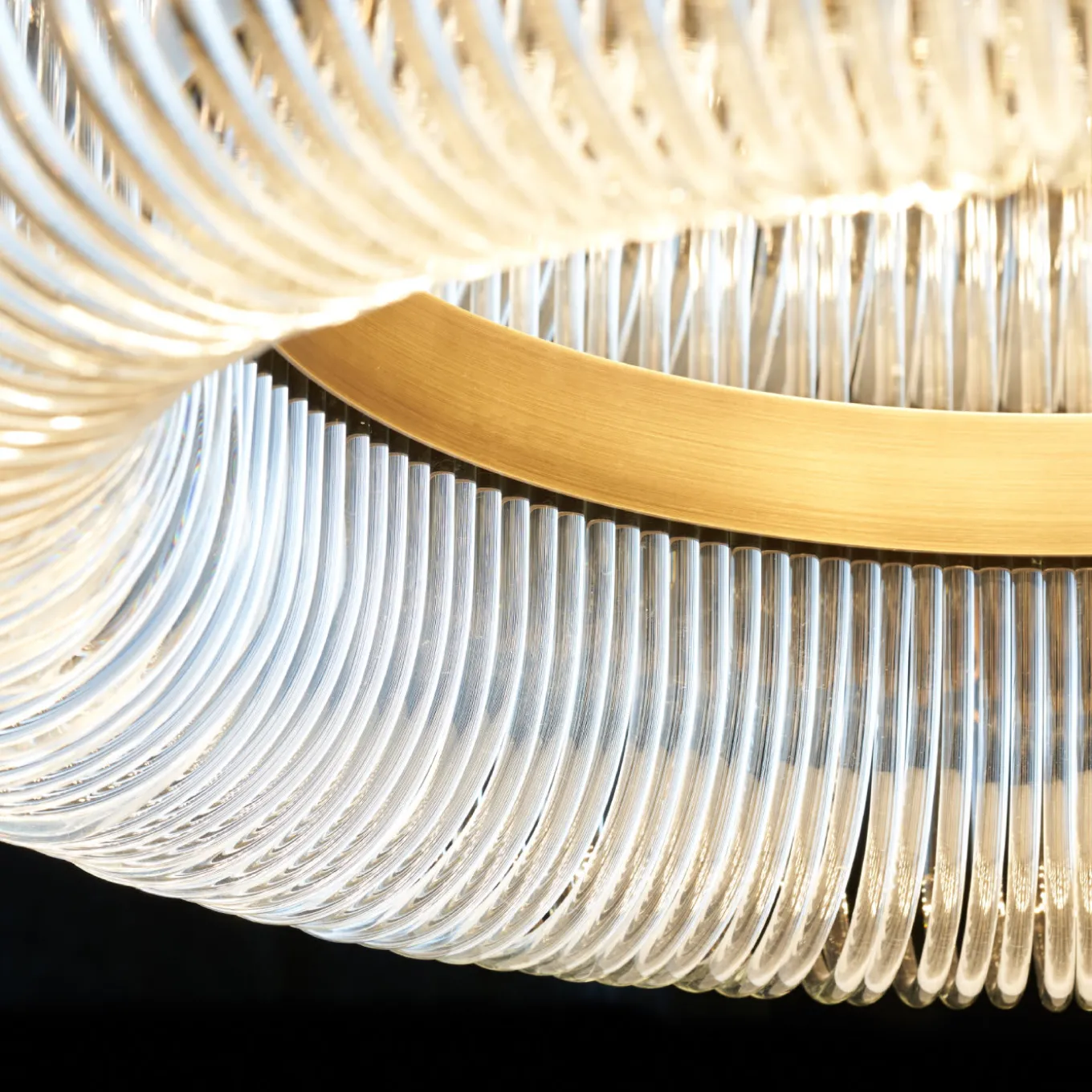 The modern Bovola chandelier is a handcrafted creation inspired by Art Deco. The chandelier is crafted in bronze and the lampshade consists of hand-made clear glass rods. The 24 light-bulbs are type: G9 max 33W. The type of light, light control, glass color, metal finishing and size are all customizable. Contract and commercial certifications available upon request.