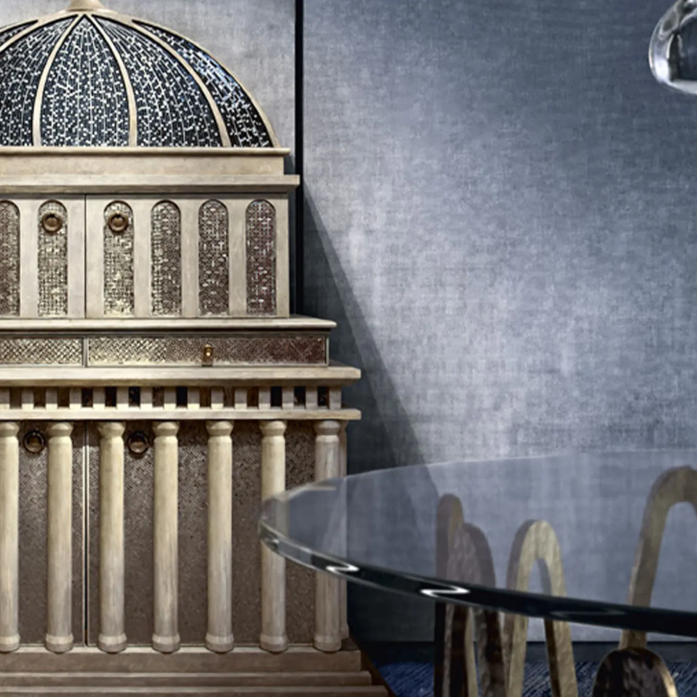 Designed by Massimiliano Raggi, this cabinet is a magnificent, one-of-a-kind addition to a refined interior. It reproduces in an imposing size the Tempietto in the cloister of the church of S. Pietro in Montorio, in Rome, designed by master architect Bramante. The wood structure has a hand-plastered finish and a wax coating. The bronzed and mirrored glass inserts are enriched by superb artistic mosaics that were hand-applied using gold and platinum tiles. The interior is upholstered in leather for a smooth touch.
