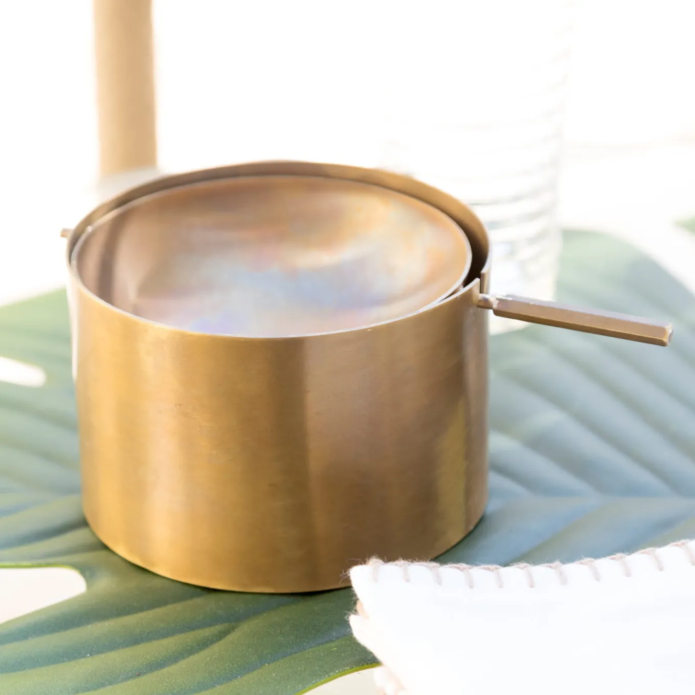 A distinctive design accent to any modern or traditional decor, this ashtray transforms an ordinary object into an exceptional piece of functional decor. Masterfully handcrafted of burnished brass, it features a deep cylindrical shape uniquely enriched with a tilting plate placed on the top. The ashtray is available, upon request, in a smaller version with a height of 6 cm and a diameter of 8 cm. Please contact the Concierge for possible customization options.