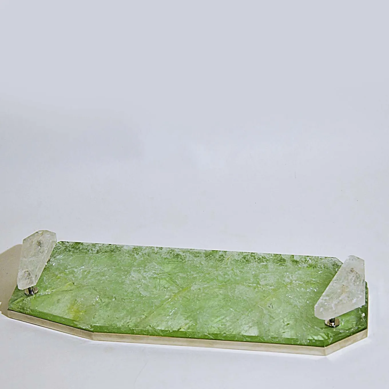 Fashioned of exquisite green quartz, this tray seemingly emerges from the rock, the jagged edges revealing expressive craftsmanship. A subtle nickel-plated brass border frames the work, highlighting the rich texture and color of the crystal. Stunning white striations complement the faceted hyaline quartz handles, adding balance and textural harmony to the work. A harmonious merging of natural stone and metal, this exceptional work of art adds understated sophistication to any decor.
