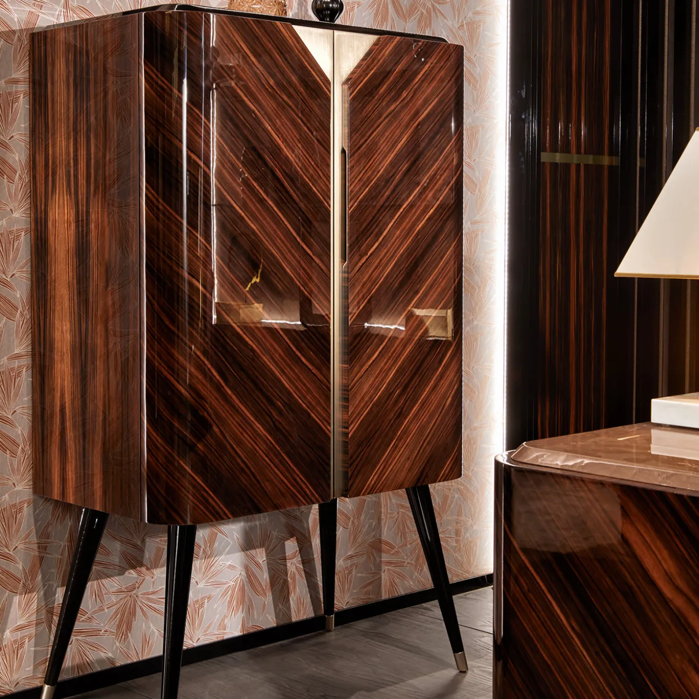 Testament to the beauty of natural wood, the Brent Bar Cabinet is made in stunning Macassar ebony, with carefully placed panels that exalt the wood’s veins. Standing on flared legs inspired by mid-century modern designs, the bar cabinet with a glossy finish draws in the eye and promises an enchanting dinner party. Two doors, gold accents. A taller cabinet version is also available.