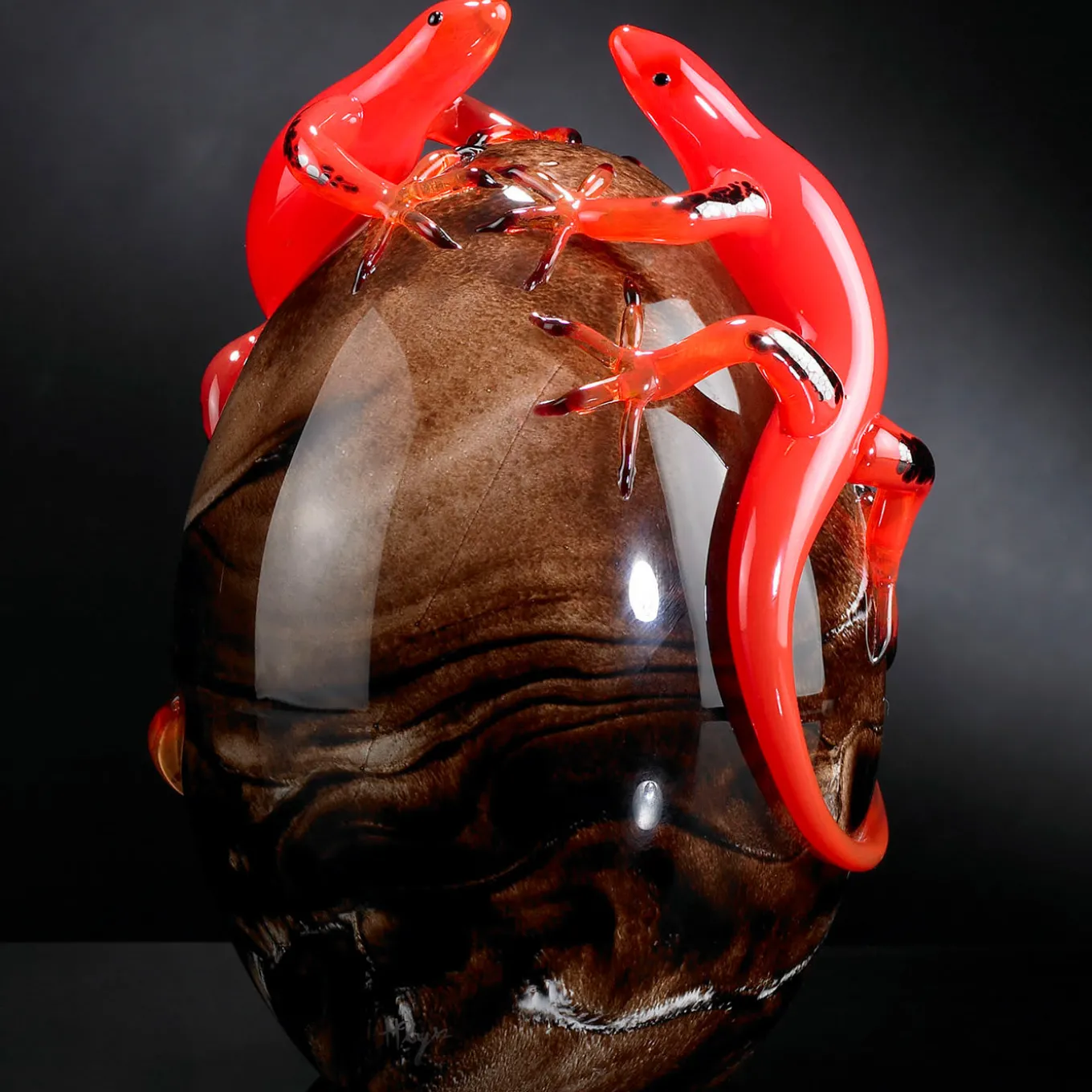 Making a lively and singular addition to a modern console, sideboard, or coffee table, this glass figurine comprises a small egg enhanced with mesmerizing brown hues, and two red geckos holding tight onto its polished surface while looking into each other’s eyes.