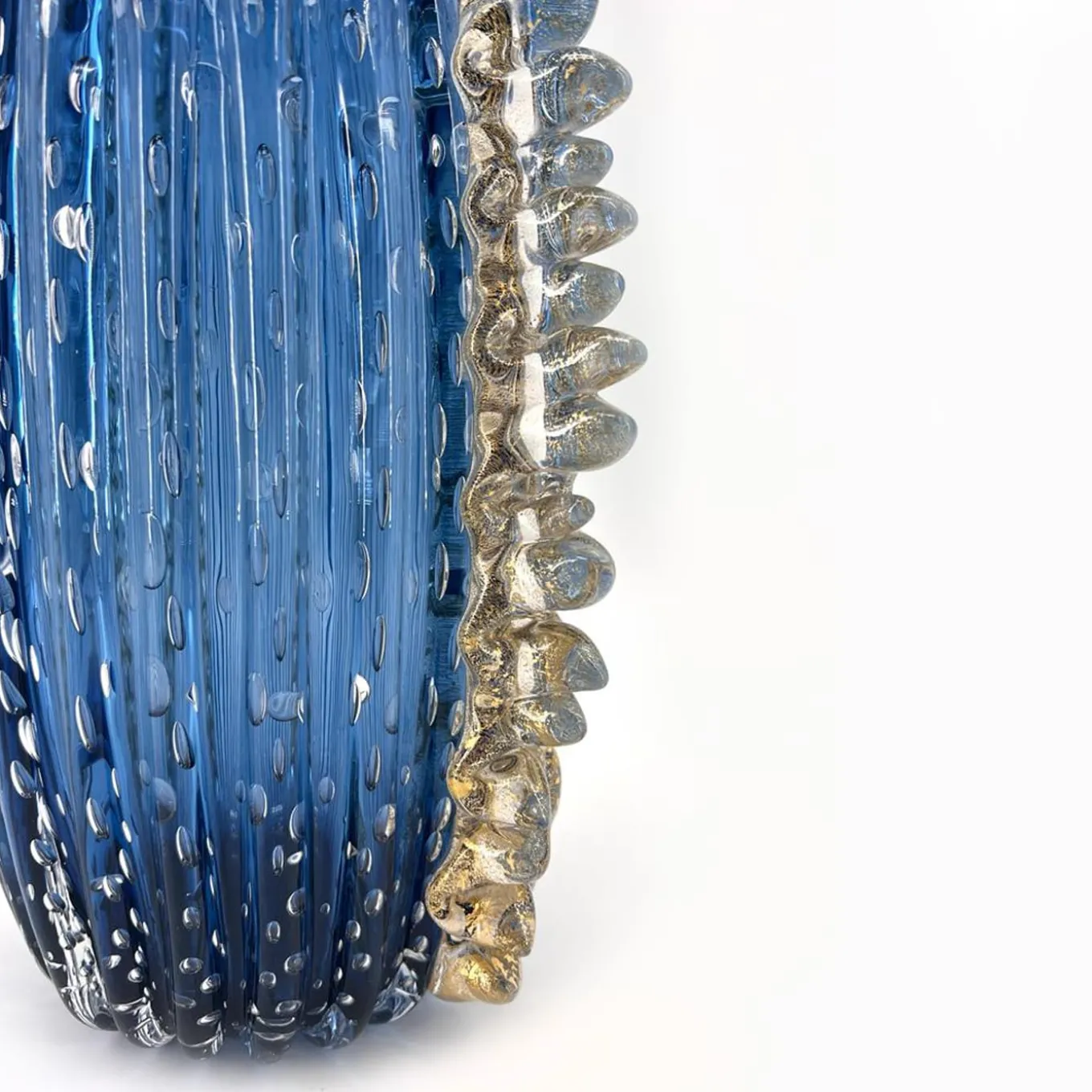 Eccentricity and freshness characterize this one-of-a-kind Murano glass vase, which owes its uniqueness to a precious manual crafting process. Featuring indented clear glass filaments enriched with 24K gold specks applied thanks to the “incalmo” method, the vase boasts a flounced navy-blue body embellished with air bubbles trapped within, obtained by following the ancient submerged “balloton” technique.