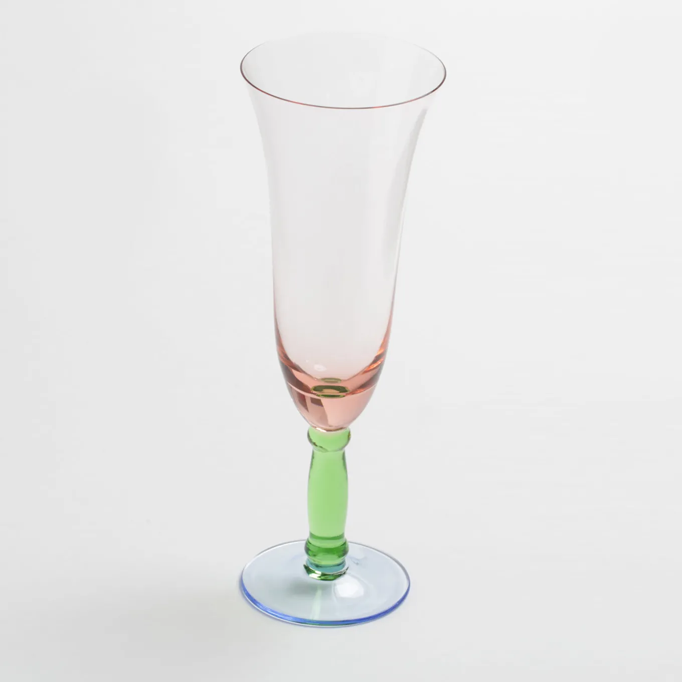 This exquisite set is comprised of Two liquor glass (Ø 6 cm, H 11 cm) ,Two wine glass (Ø 8.5 cm, H 17 cm)and Two flute (Ø 7.5 cm, H 21 cm). Each glass features elegant lines and vivid colors: pink on the body, green on the stem, and pale blue on the base.