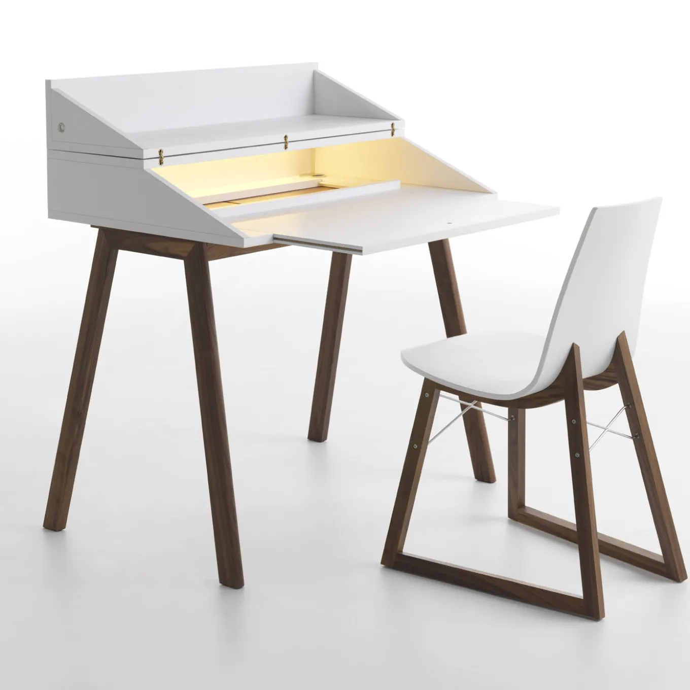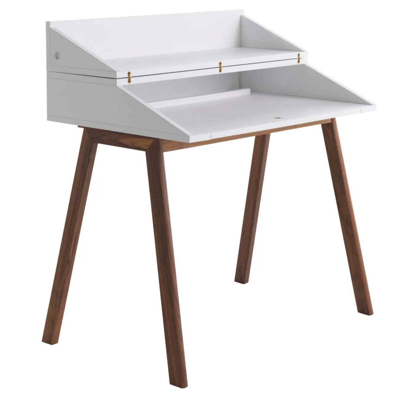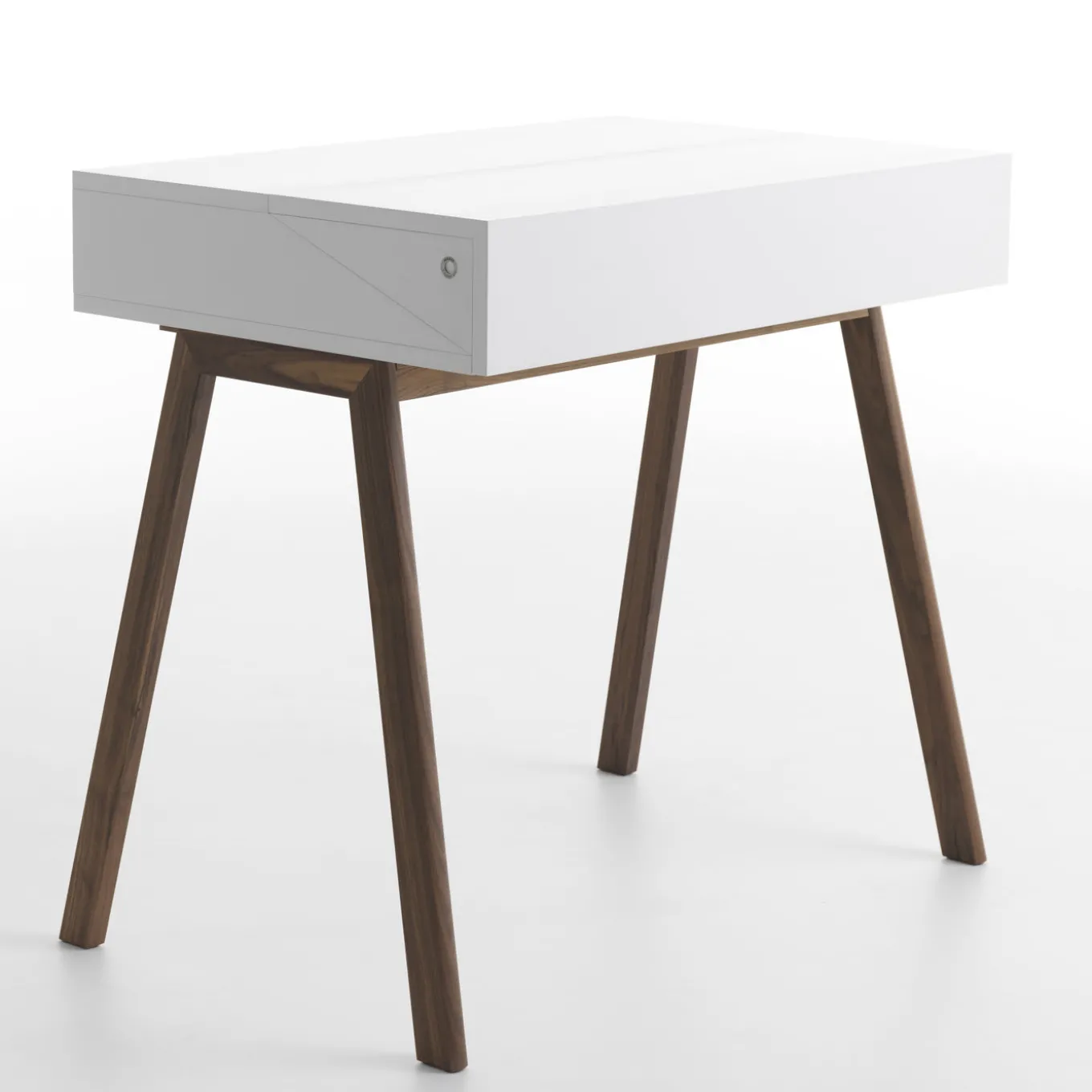 This modern piece of functional decor designed by Esa Vesman boasts a clean, elegant allure. Versatile and innovative, it stands on Canaletto walnut wood with a white-lacquer finish and features a hutch in MDF that flips open revealing a functional storage space equipped with LED light and cable hole. Please ask the Concierge for specifications.