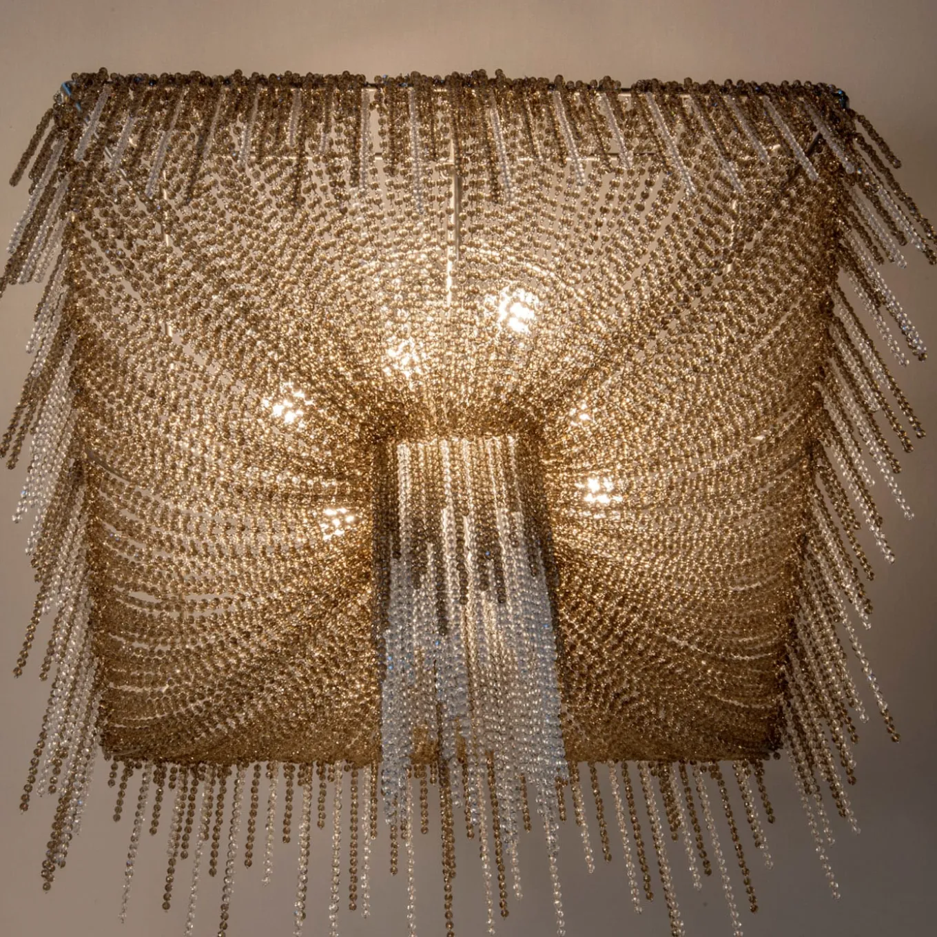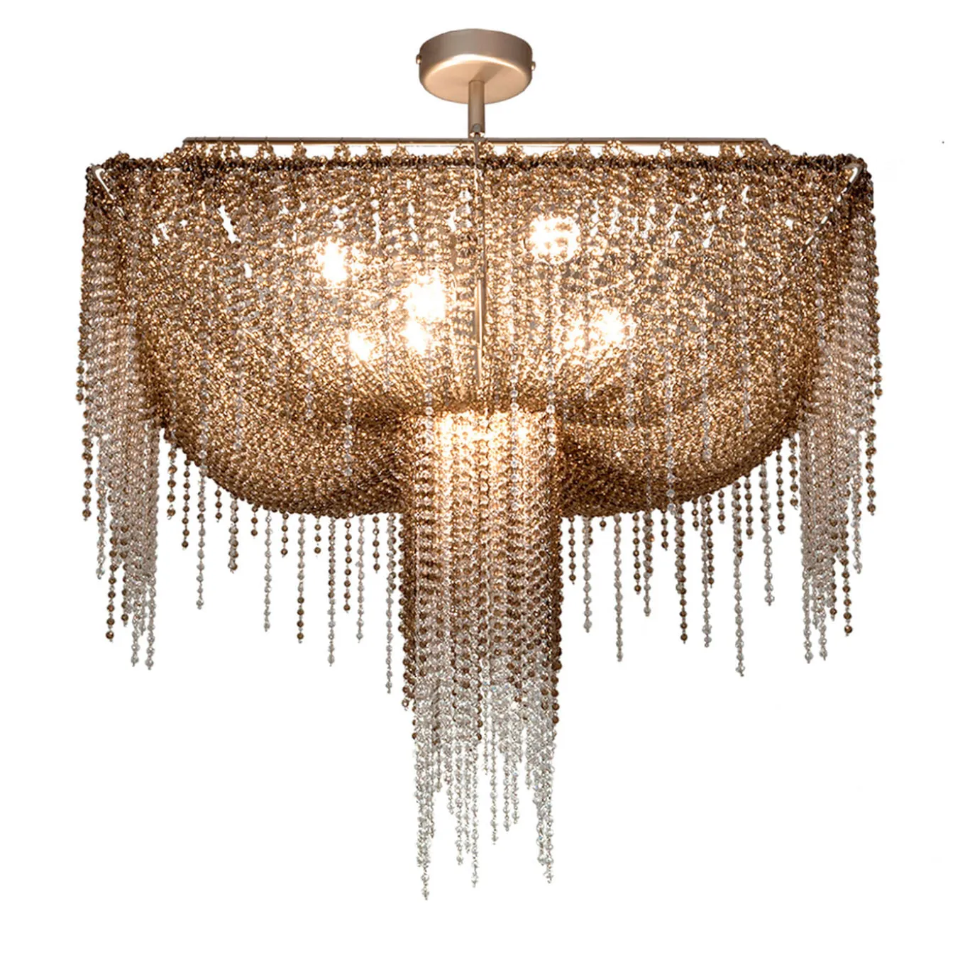 A drapery, some feathers, some precious gems: this is what comes to mind with Burlesque, a family of chandeliers with a strong personality. The protagonists here are the pearls with that multitude of precious strings that, just like a veil, lie down over the metallic structure of the lampshade, making it almost invisible. A collection capable of expressing a certain idea of femininity: mysterious, intense. 6 lights ceiling lamp. Bulb not supplied. Available in custom sizes and finishes. Metal and crystals. Champagne, smoky & clear crystals.