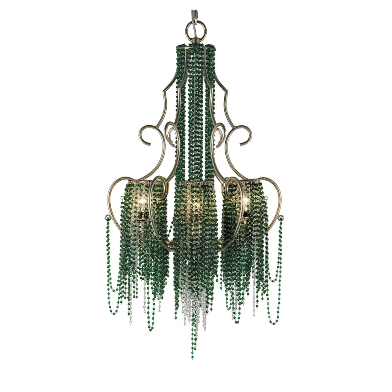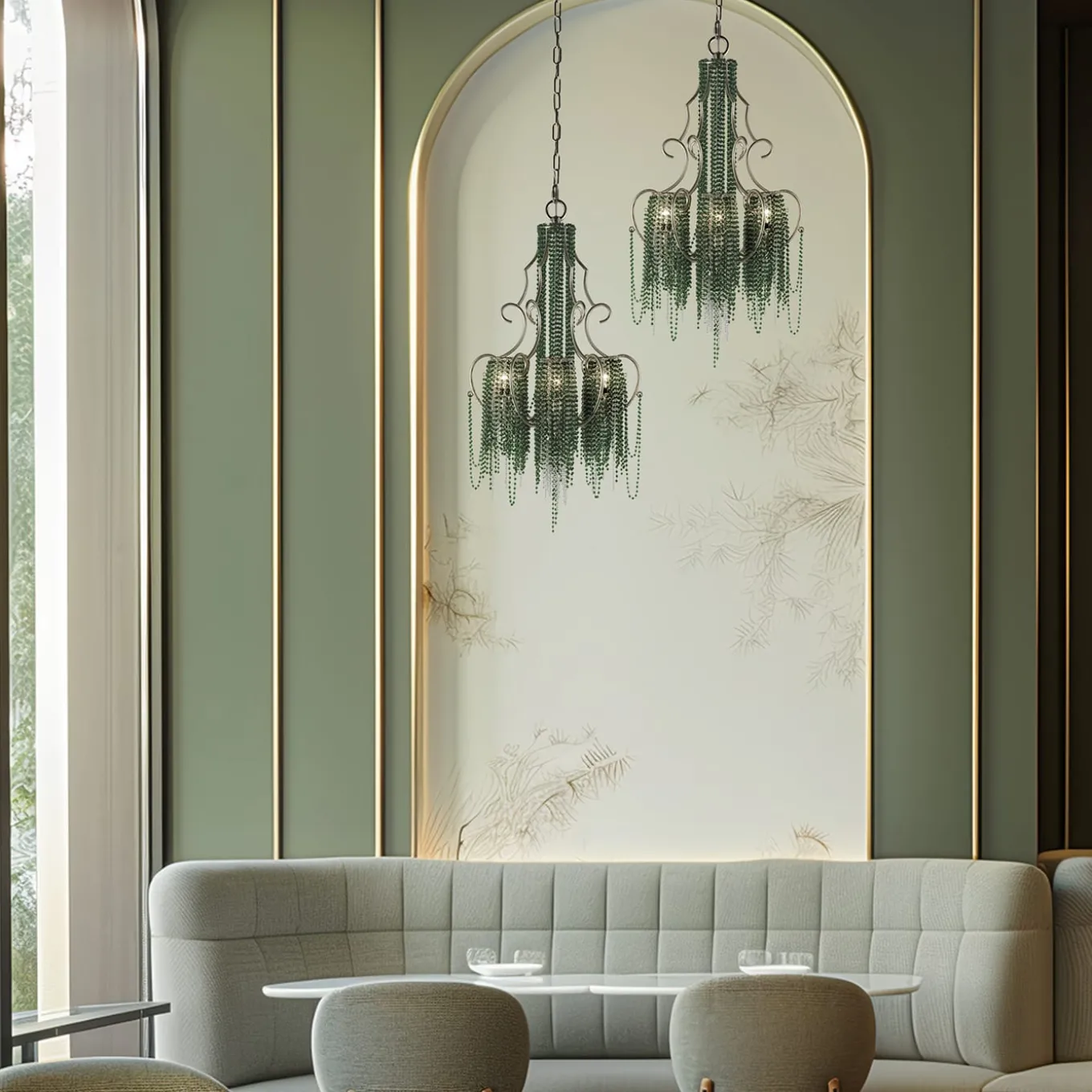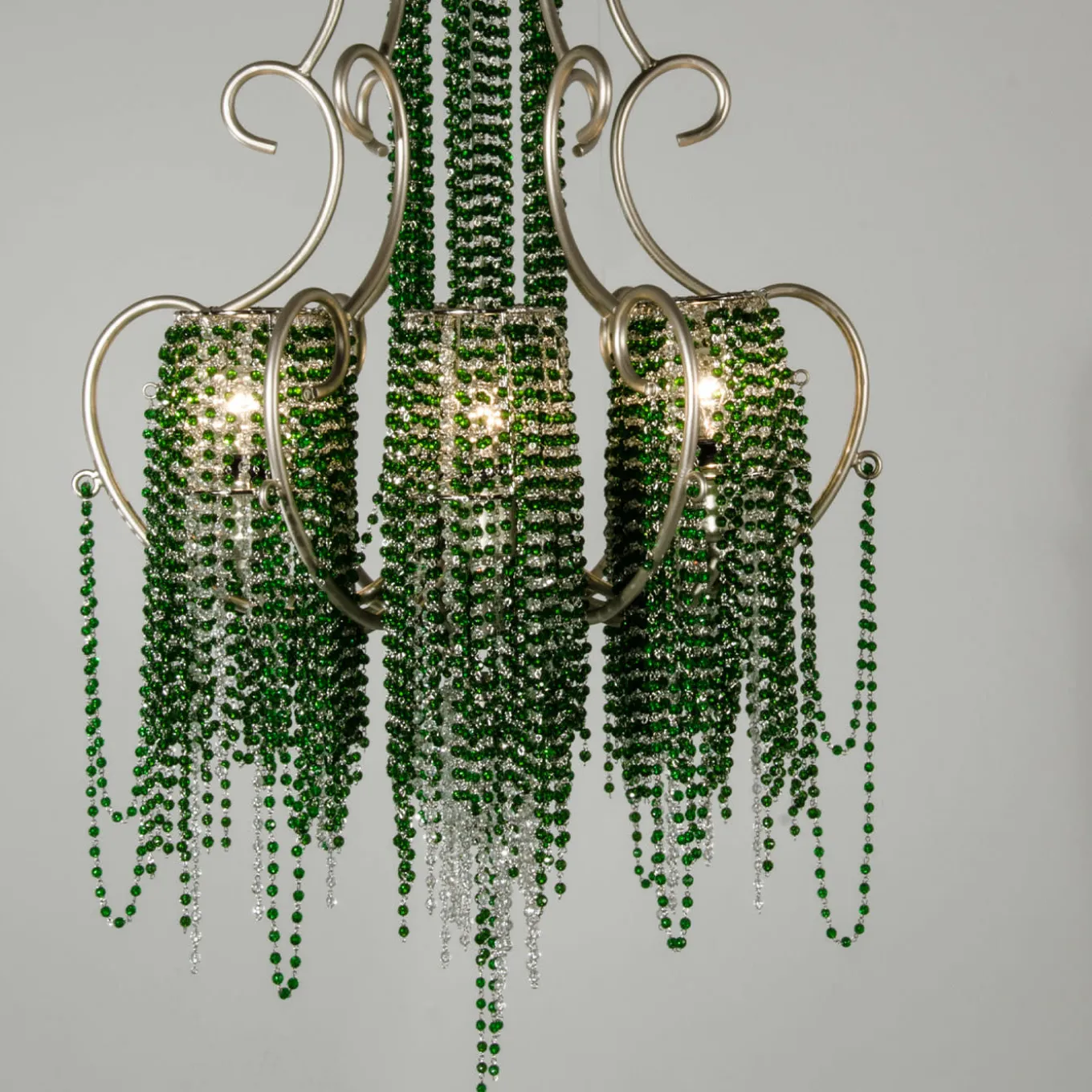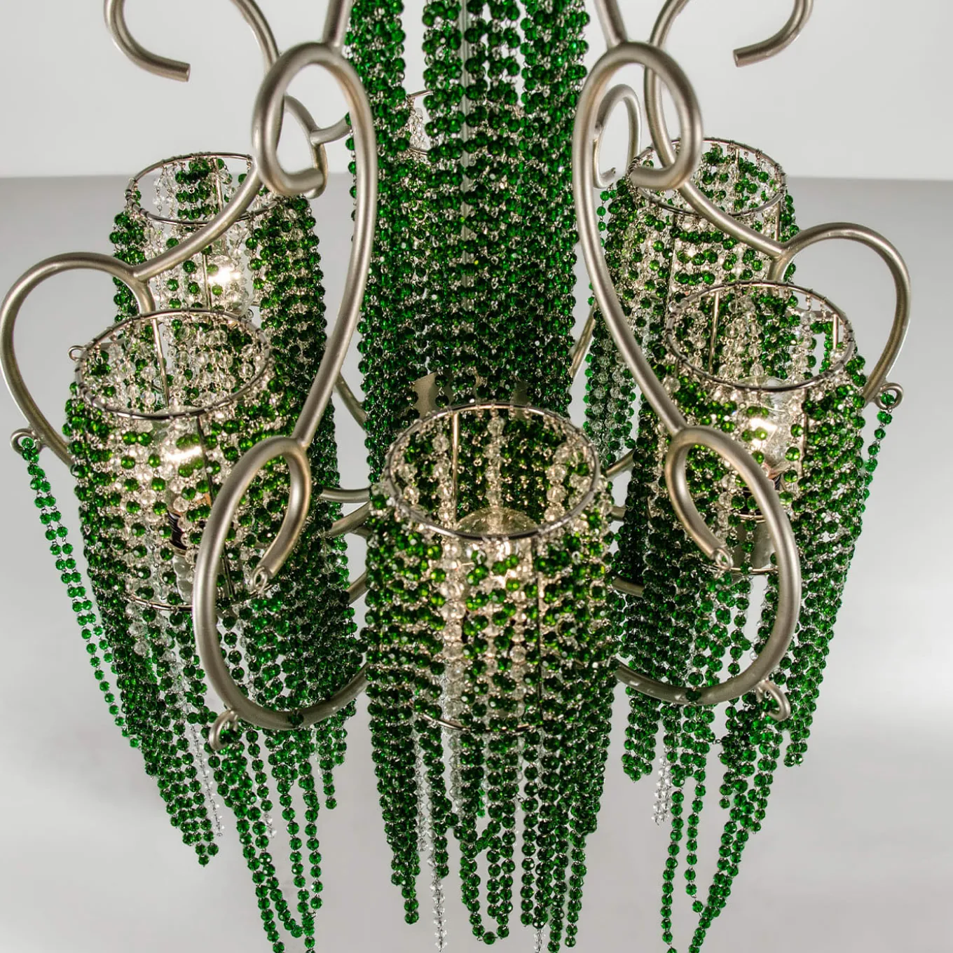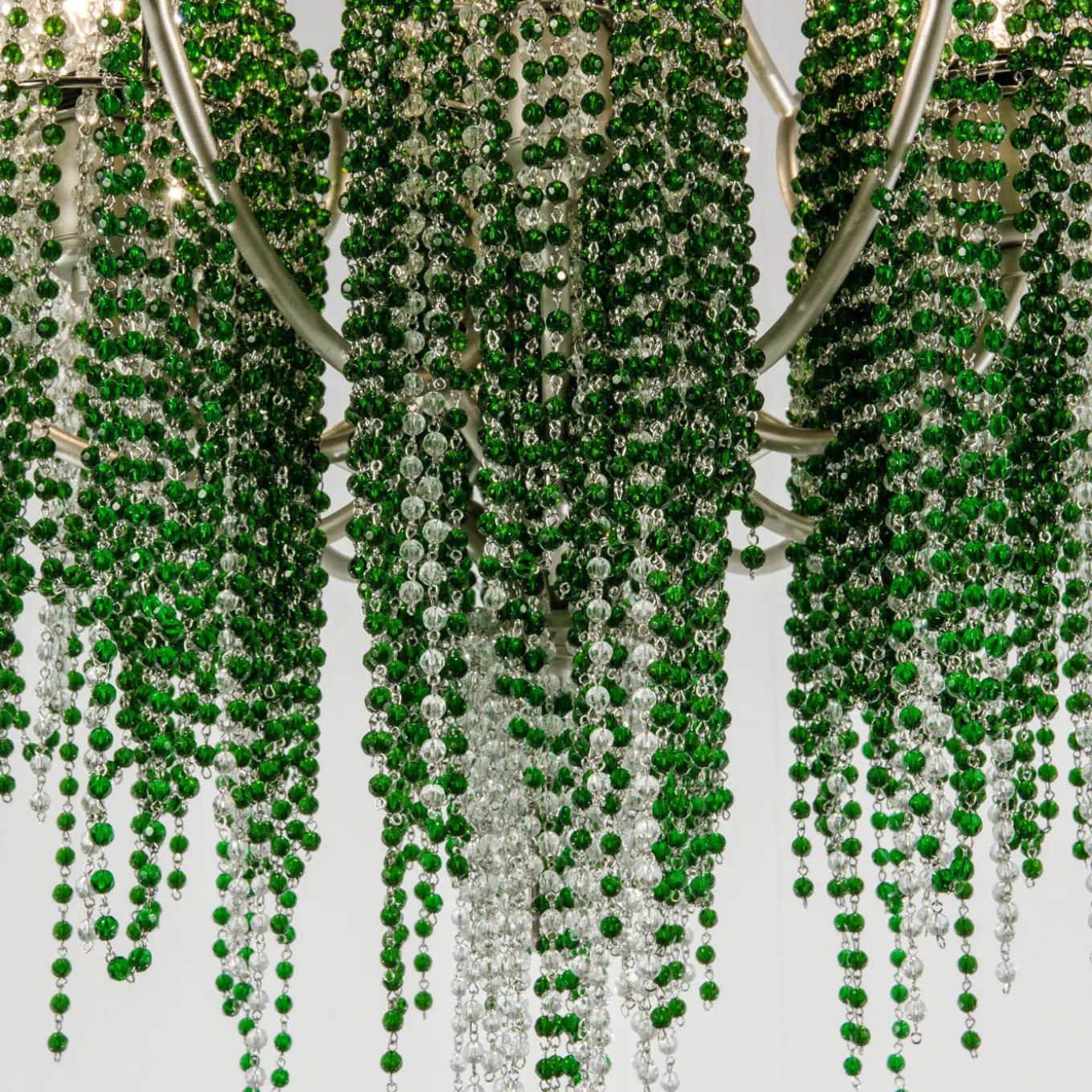 A drapery, some feathers, some precious gems: this is what comes to mind with Burlesque, a family of chandeliers with a strong personality. The protagonists here are the pearls with that multitude of precious strings that, just like a veil, lie down over the metallic structure of the lampshade, making it almost invisible. A collection capable of expressing a certain idea of femininity: mysterious, intense. 6 lights chandelier. Bulb not supplied. Available in custom sizes and finishes. Metal and crystals. Champagne, green & clear crystals.