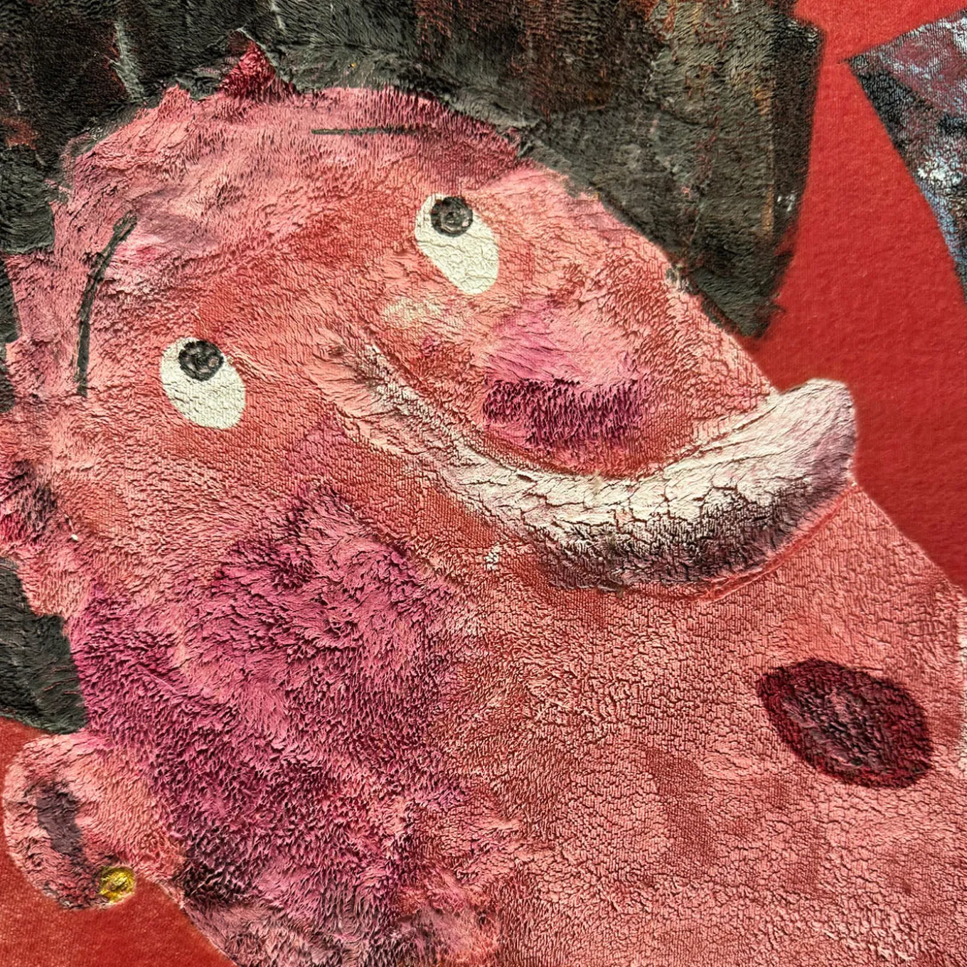 This vibrant tapestry features a hand-dyed velvet silk base in crimson and burgundy tones enhanced with colored pastes. It incorporates a transparent Murano glass element with gold leaf, creating dynamic visual effects that change with the perspective and light. Mounted on a sturdy wooden frame, the piece reflects Venetian traditions through meticulous detail and innovative technique.