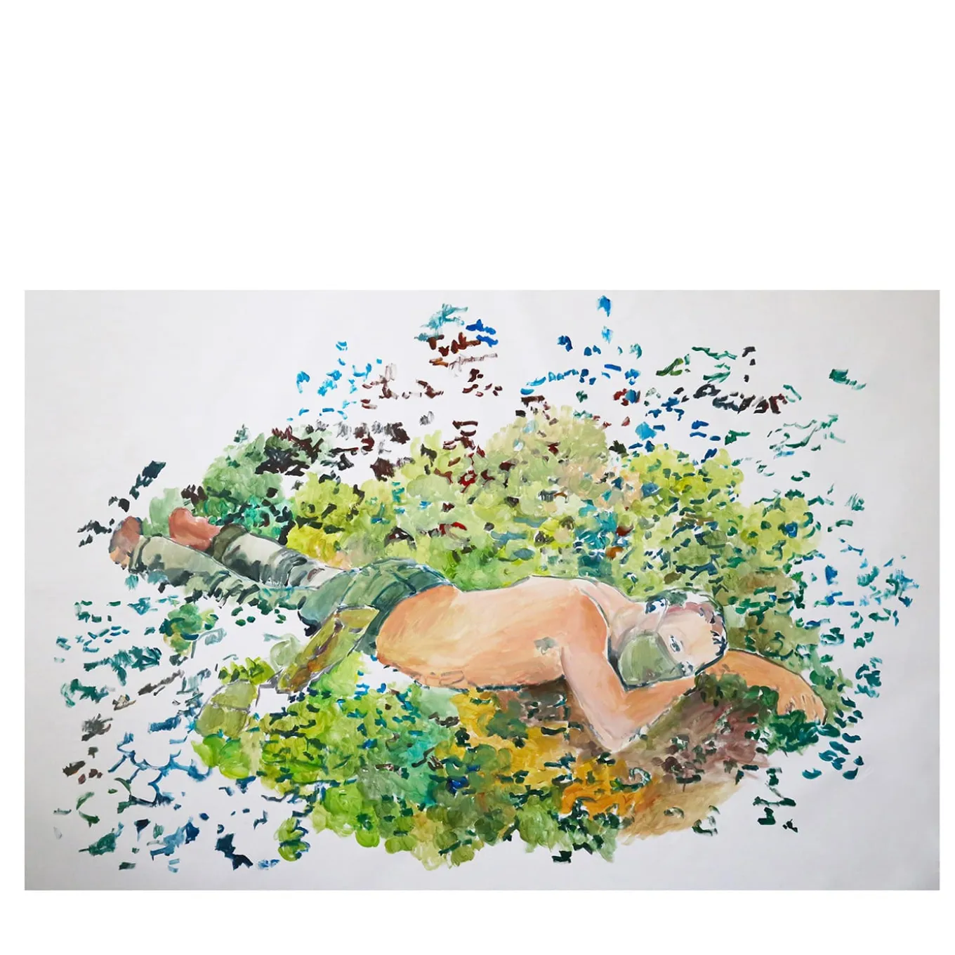 A magnificent work of art from the “By this river” series, this painting explores feelings of solitude in relation to the concept of identity, and human detachment from nature. Depicting a young guy laying on a softly shaded field, wearing a green yet see-through face mask symbolizing today’s life. Please consult the Concierge for further information. This is a unique piece of art. Delivered with a certificate of authenticity. Frame not included.