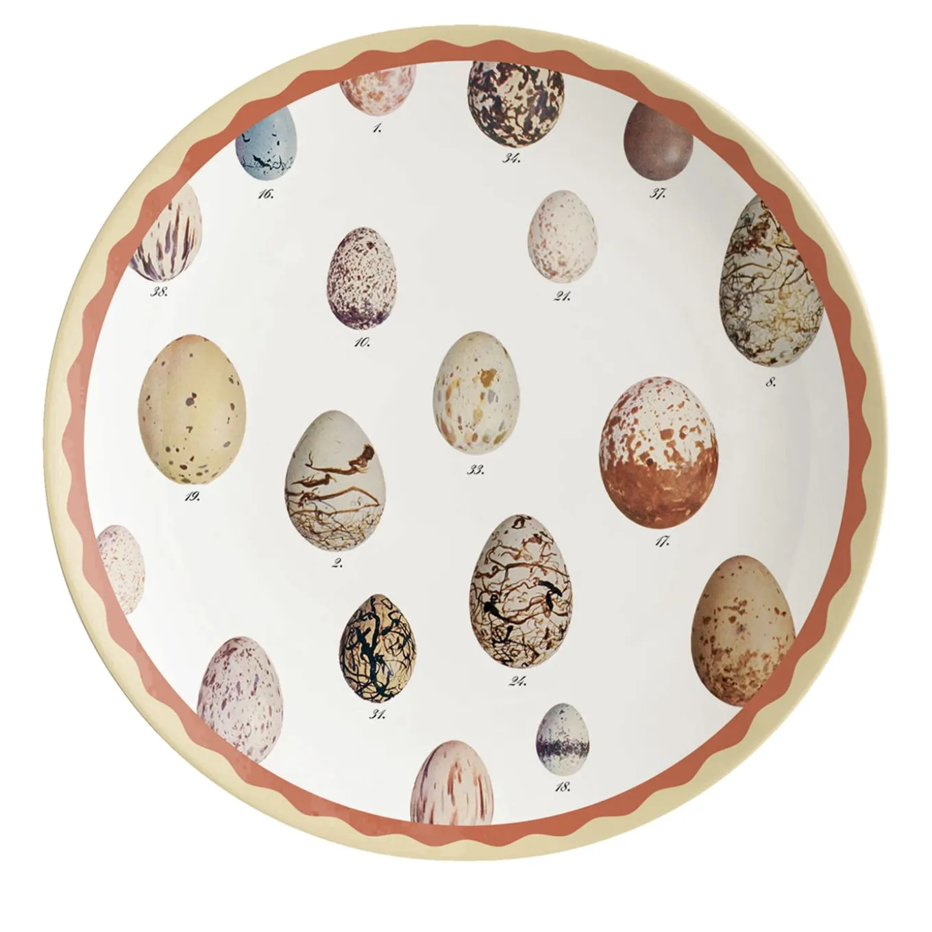 An original design from the Eggs series of the Cabinet de Curiosités Collection of ceramic ware, this set of two dessert plates will make an iconic accent piece during a special dinner. Superbly handmade of ceramic and finely decorated, it boasts an array of egg species rendered in a realistic way, juxtaposed to a white backdrop enhanced with a multi-colored rim.
