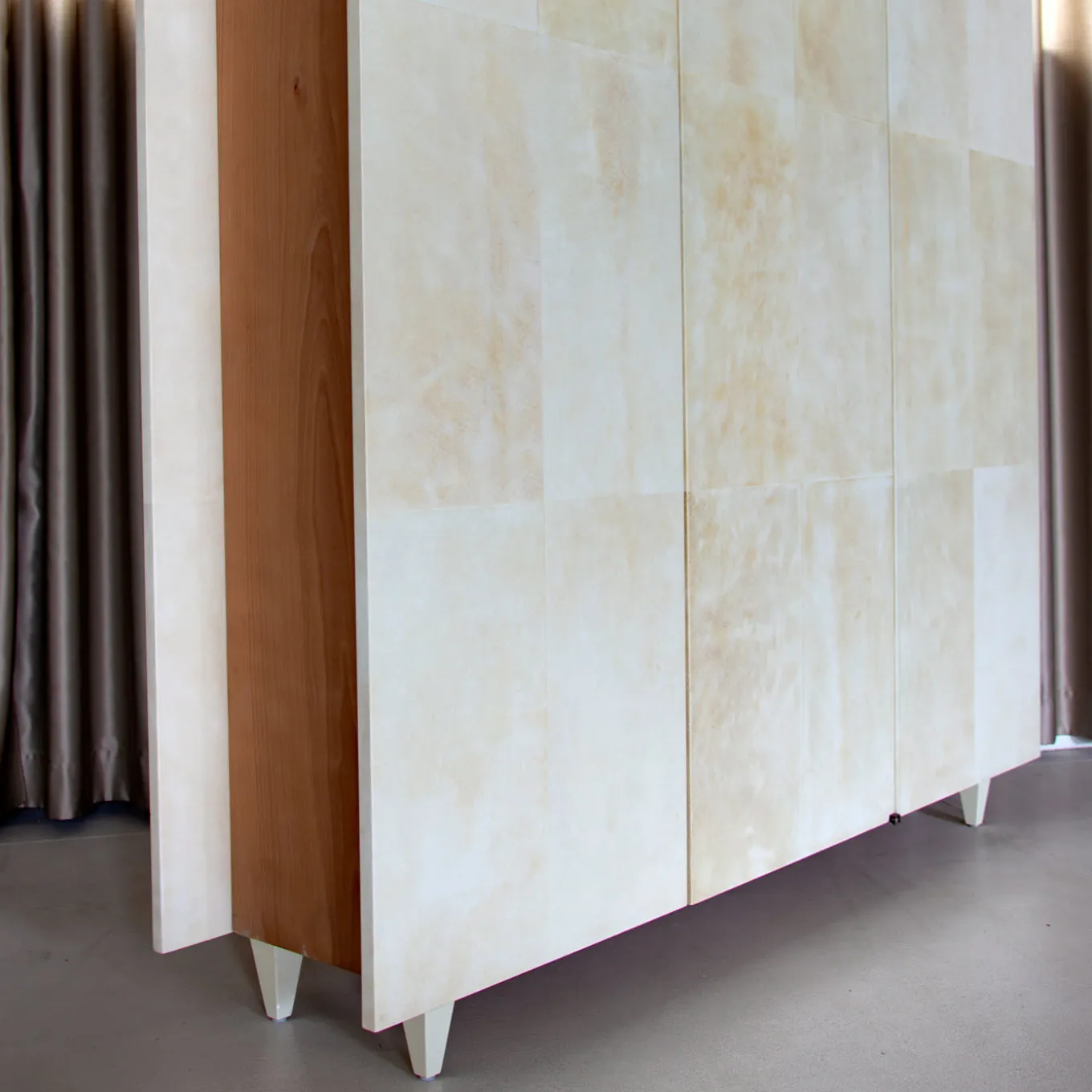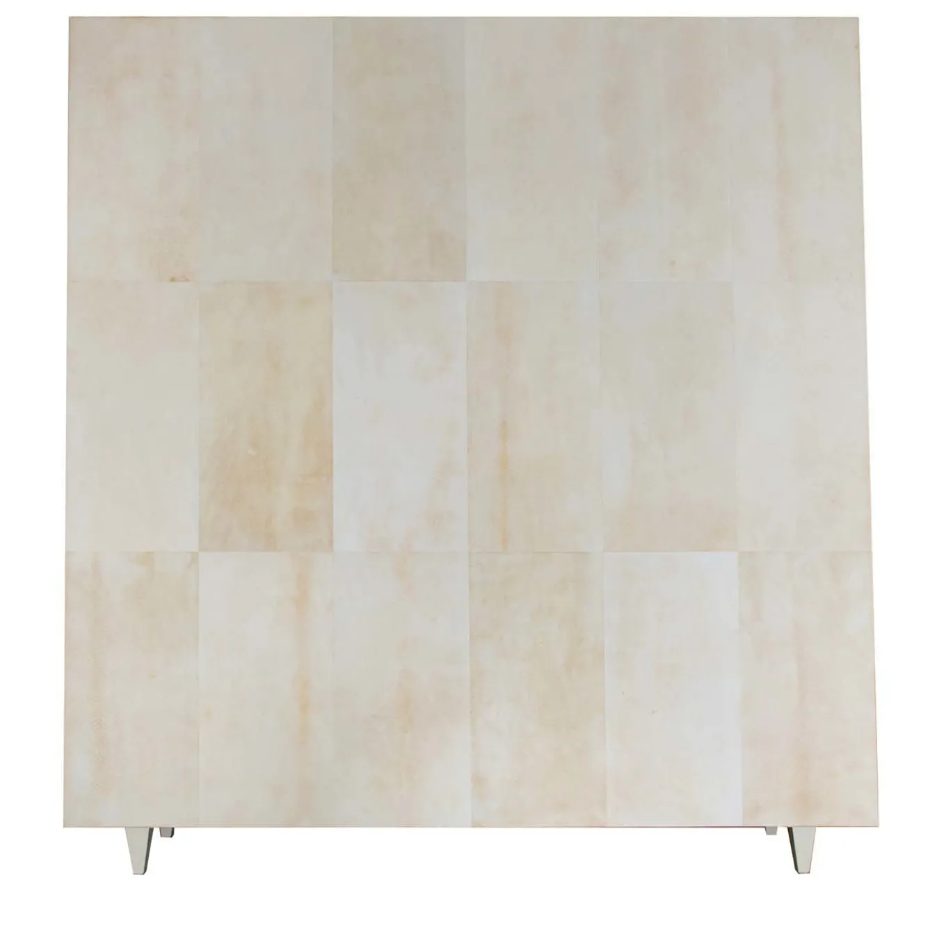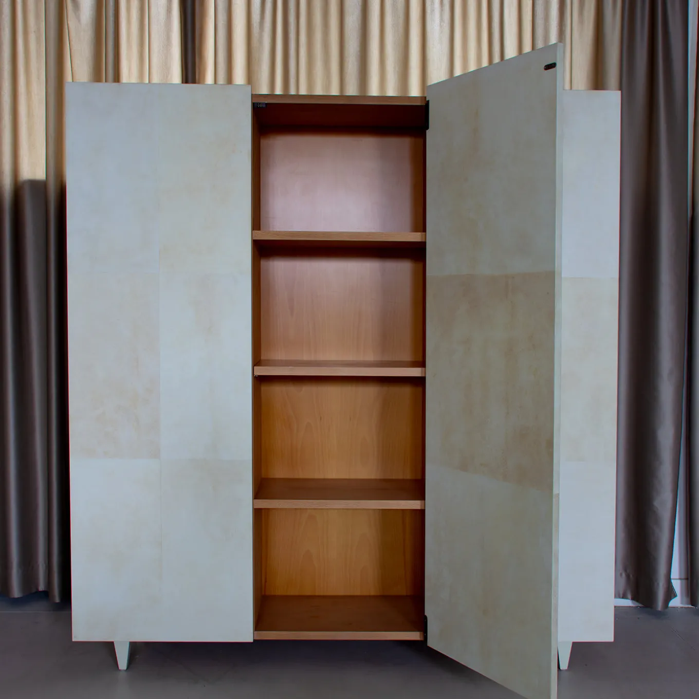 An exclusive design by Renzi e Reale, this cabinet is entirely wrapped in matte natural parchment and features three doors that open to reveal an interior in natural wood with three shelves in each section. The tall, rectangular structure stands on four short, conical feet with the same parchment finish. Designed to expand storage in any room, this cabinet can be used also in a loft as a room divider, thanks to the precious finish that covers all sides.